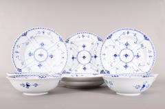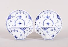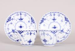 Paar Mokkatassen mit Untertassen, Royal Copenhagen, Dänemark, Dekor "Musselmalet gerippt, Halbspitze", 20.Jh.