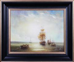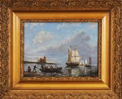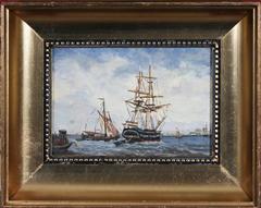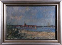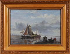 Zweimaster mit Beiboot in einem niederländischen Hafen, 20. Jhdt.