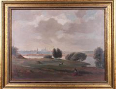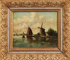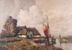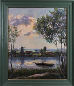 Kahnfahrt auf einem Fluss in Flachlandschaft mit Mühle, 2.H.20.Jhdt.