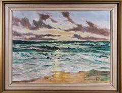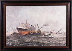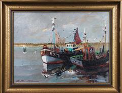 Fischerboote in stürmischer See neben Kaimauer mit Leuchtfeuer, 20. Jhdt.