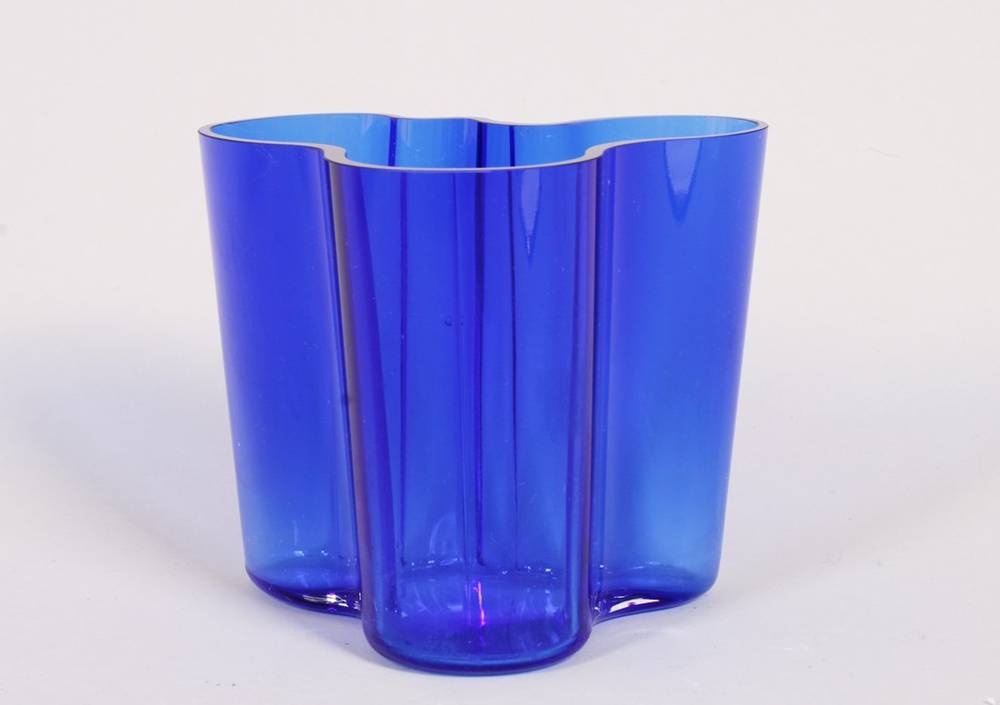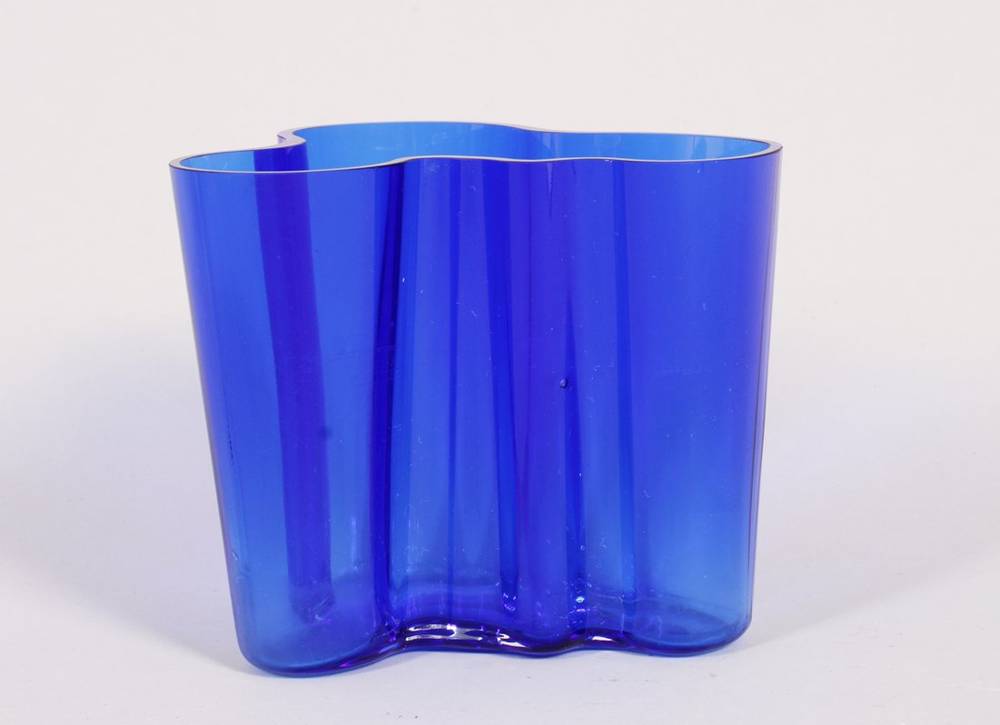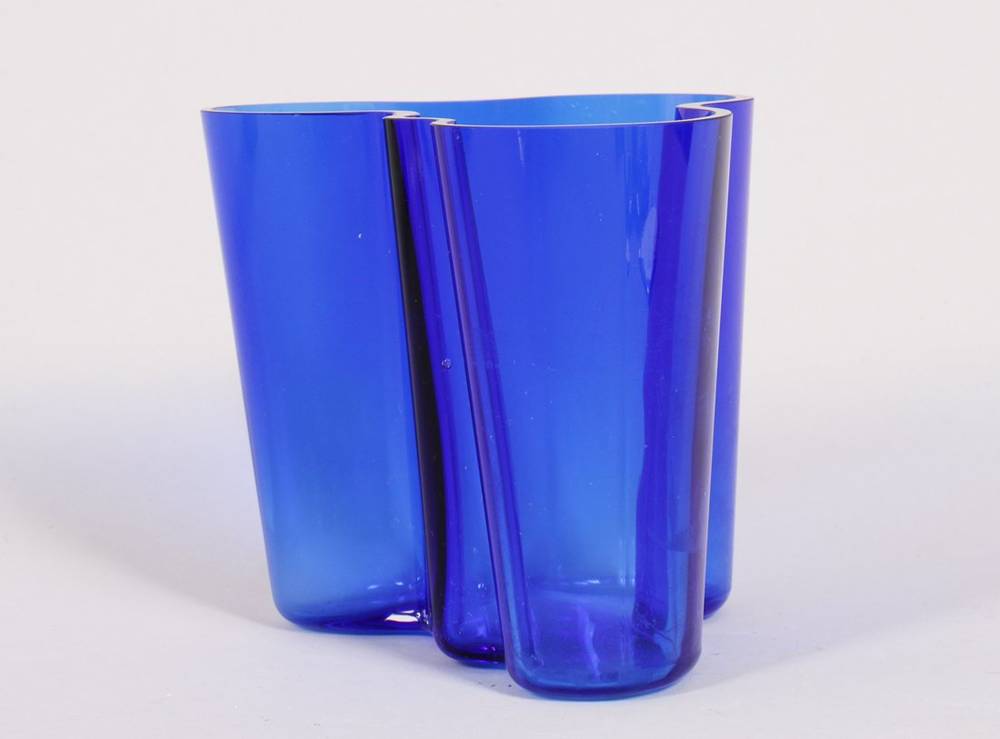 Modell 3030 Savoy, dickwandiges Blauglas in organisch-asymmetrischer Form, im Boden signiert "ALVAR AALTO", H ca. 9,5cm, Gebrauchsspuren