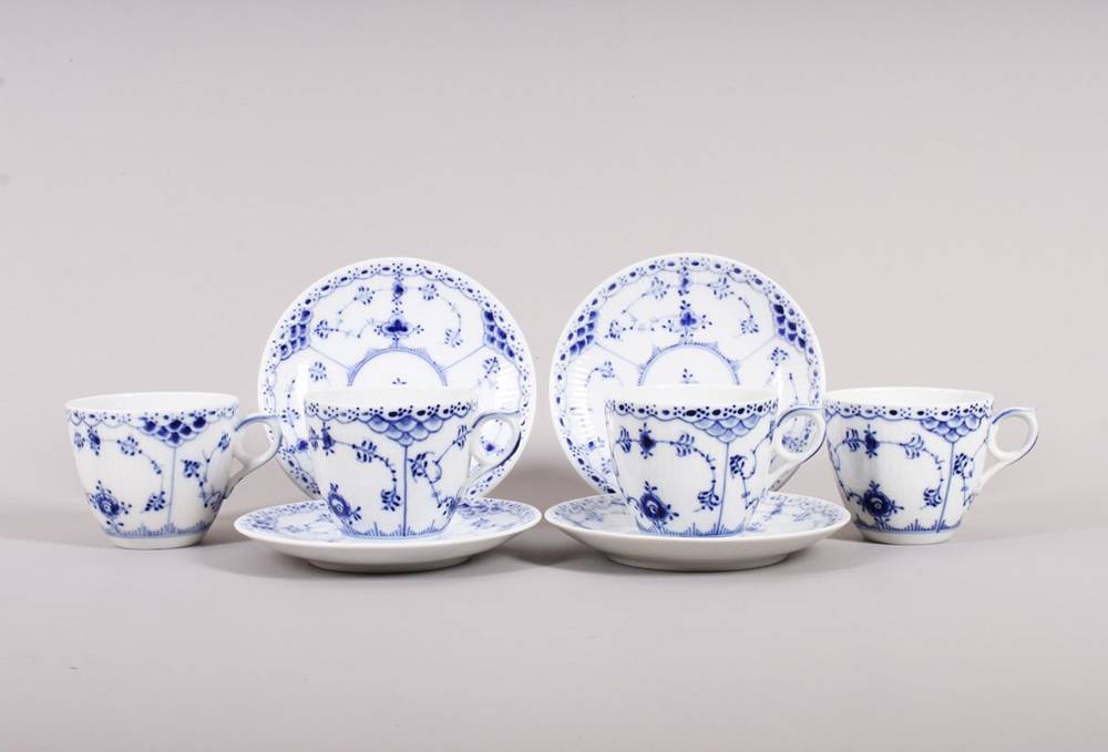 Vier Kaffeetassen mit Untertassen, Royal Copenhagen, Dänemark, Dekor "Musselmalet gerippt, Halbspitze", 20.Jh.