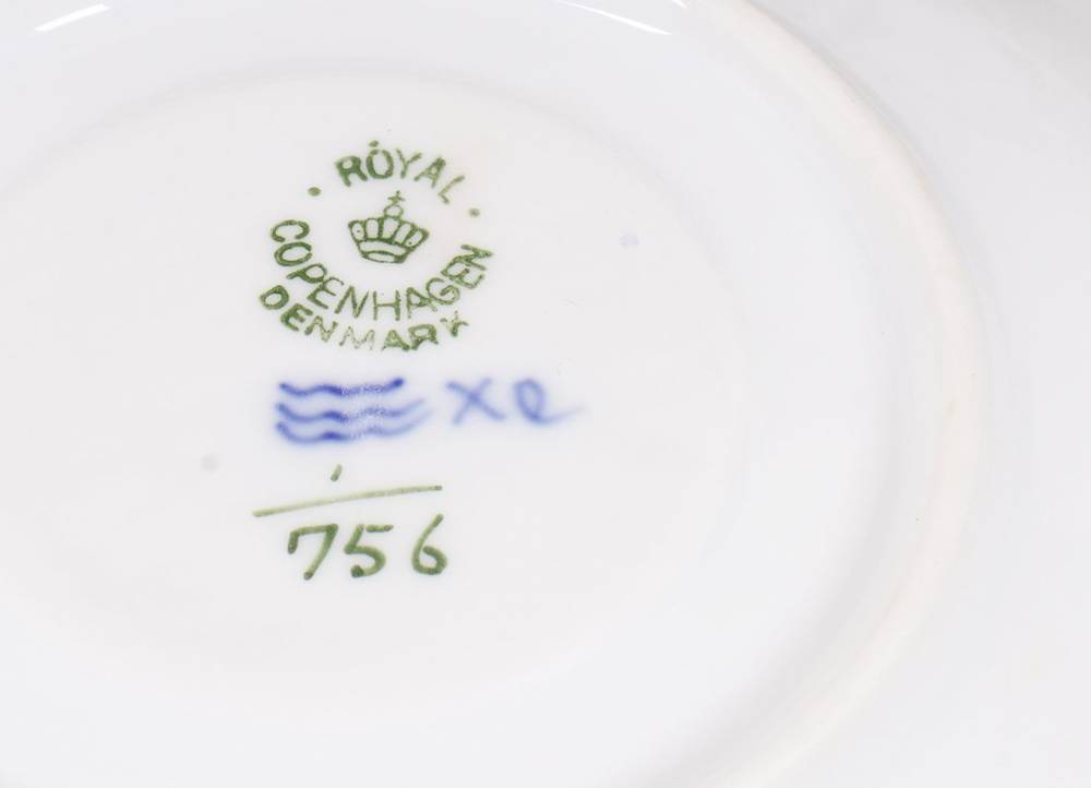 Porzellan, unter Glasur blau bemalt, vier Kaffeetassen mit korrespondierenden Untertassen, jeweils mit flächigem Strohblumenmuster, im Boden je grüne Manufaktur- mit blauer Wellenmarke sowie jeweils mit Modellnummer "756" versehen, H (Tasse) 6,5cm, D (Untertasse) 13,5cm, Marke jeweils 1-fach durchschliffen, 1 Tasse mit Haarriss