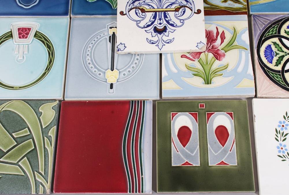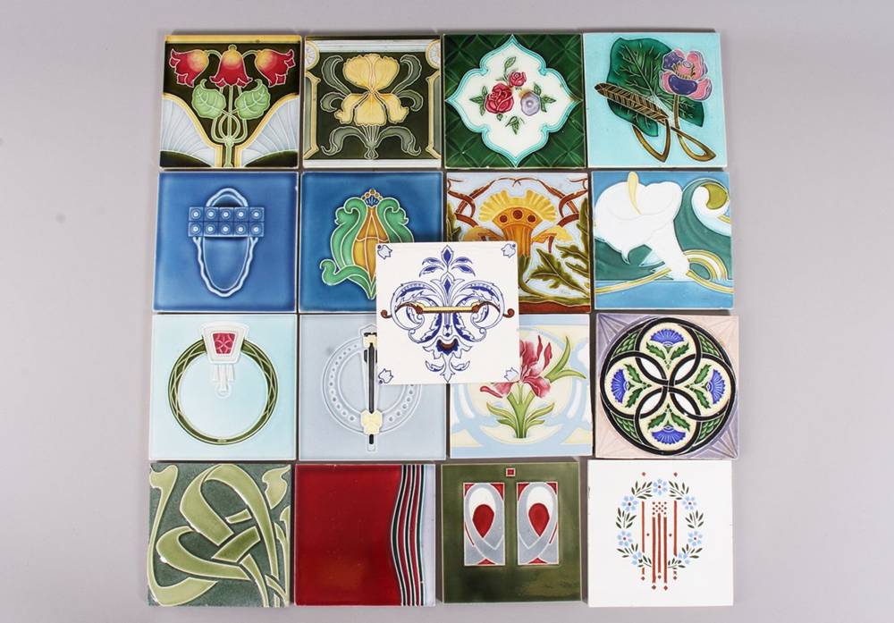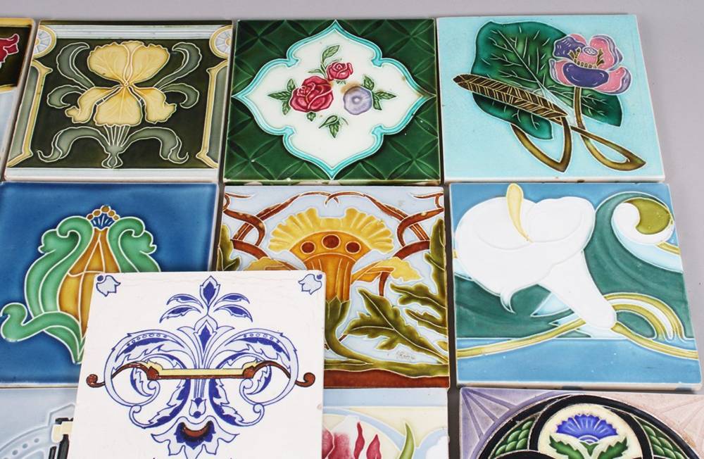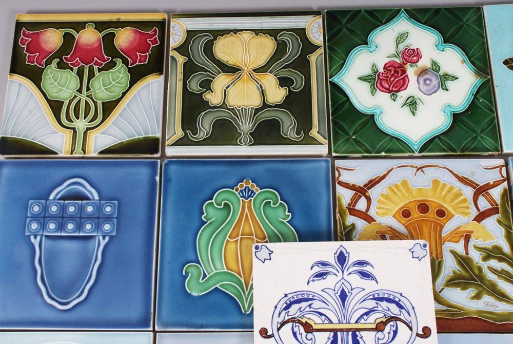 17 Jugendstil-Fliesen, Wessel‘s Wandplattenfabrik/Tonindustrie Albertwerke/Faienceries des Pavillons u.a., um 1900