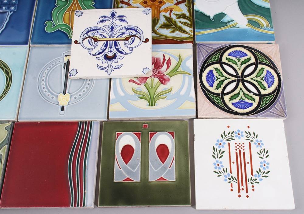 Keramik, variierende Jugendstil-Dekor, ca. 14,5x14,5 bis 15x15cm, Alters- u. Gebrauchsspuren, kl. Defekte