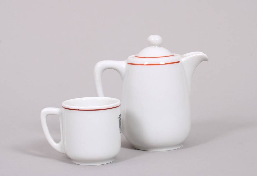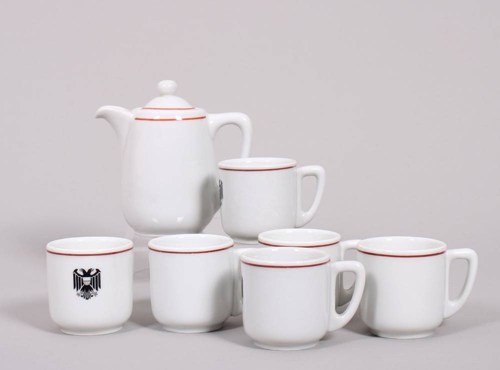consisting of 6 demitasse cups and 1 small teapot, red lined, Lübeck eagle on the front, approx. 11 cm high (teapot), slight signs of age and use