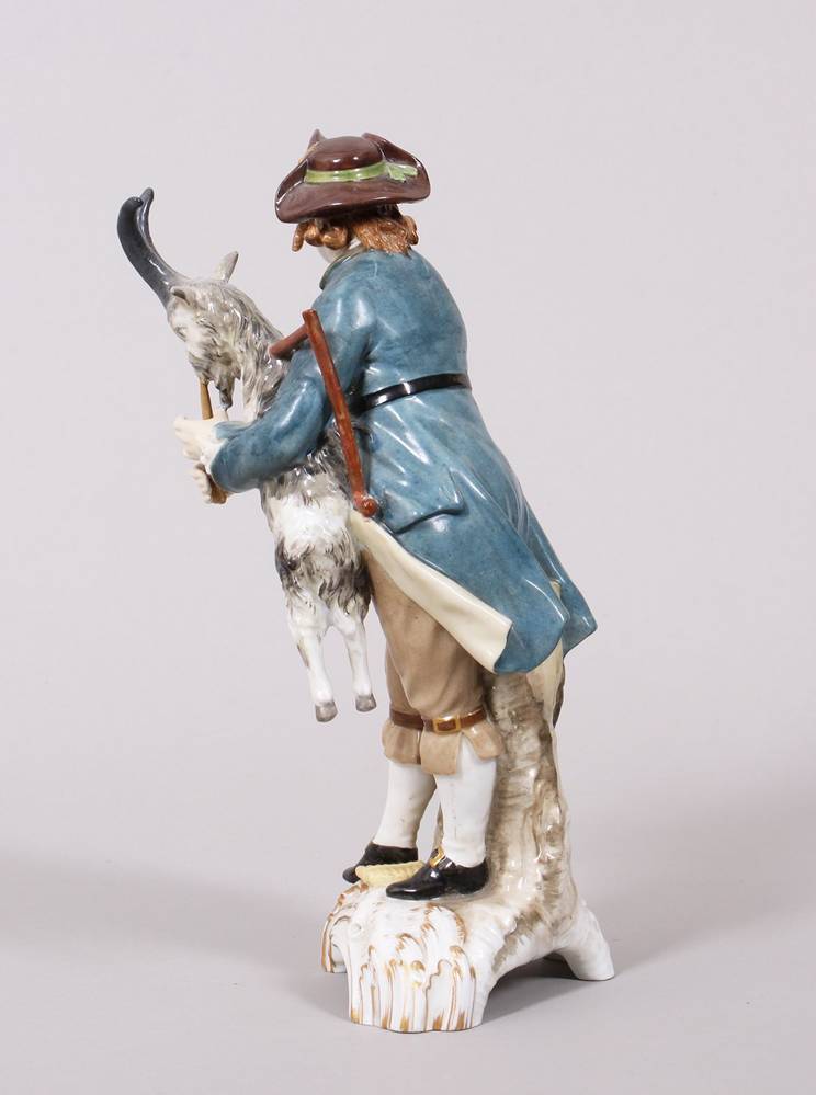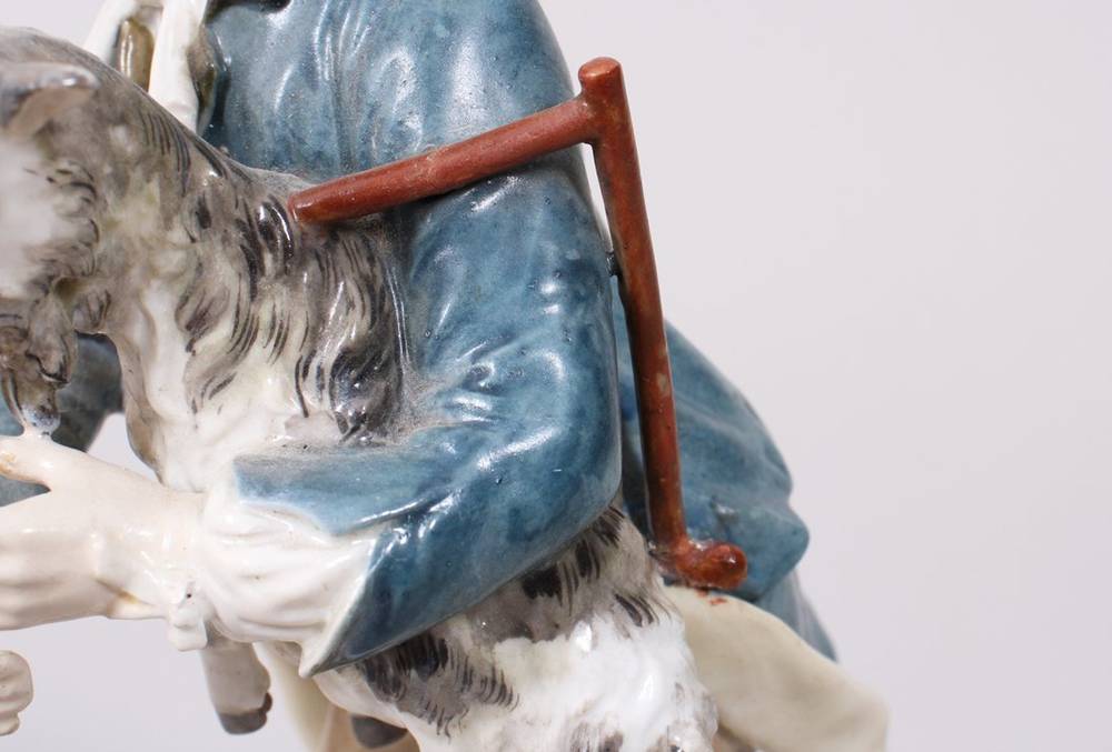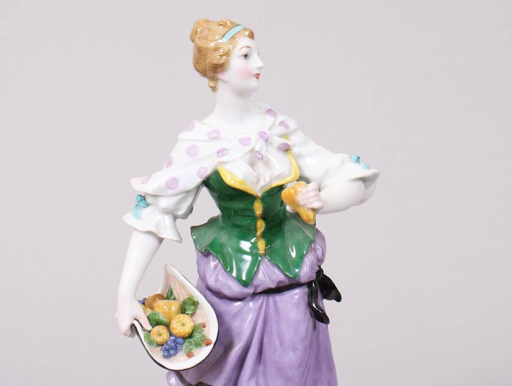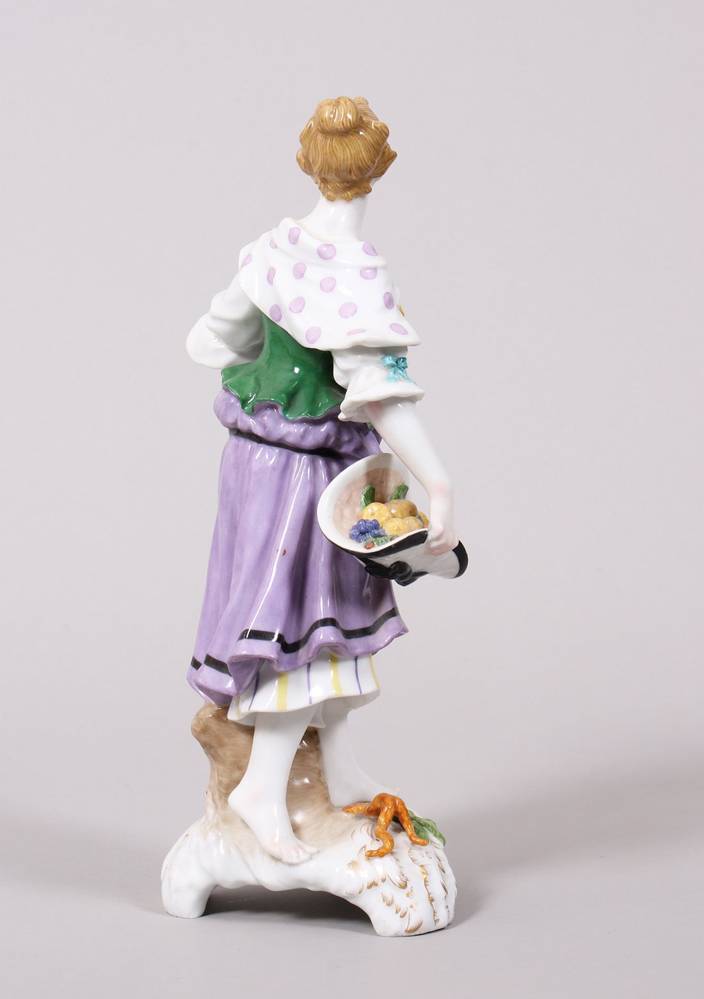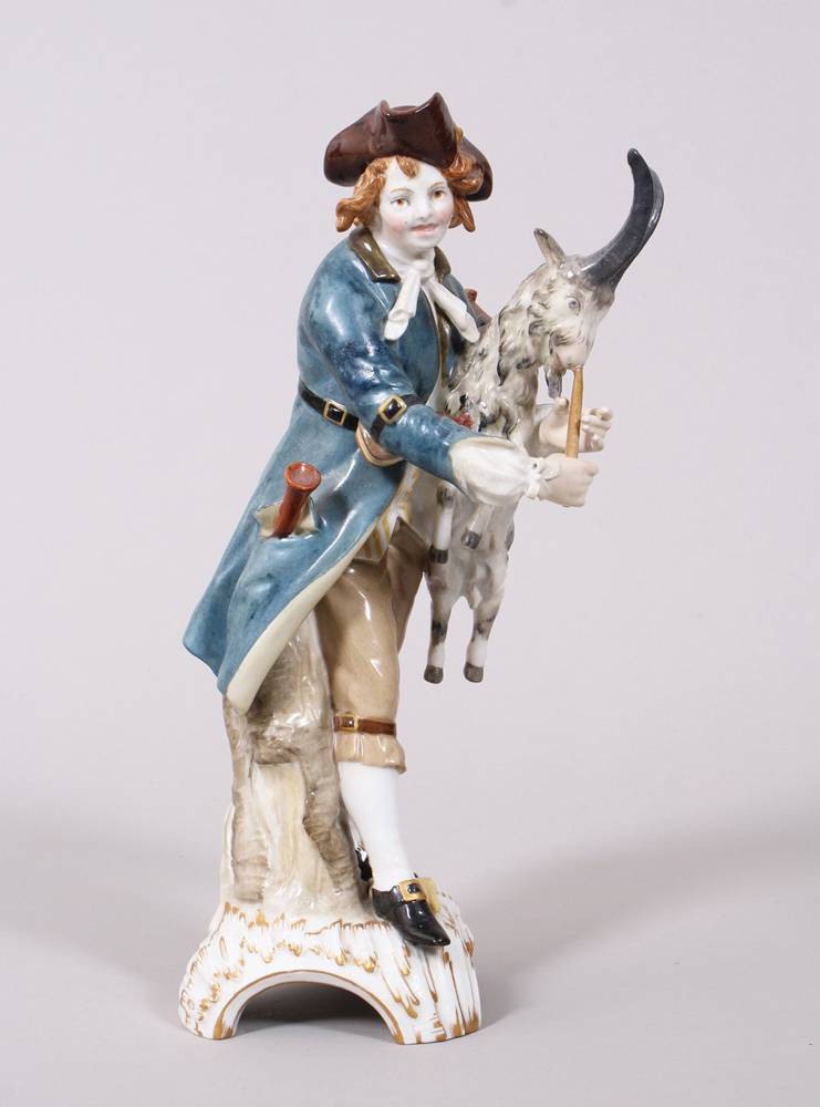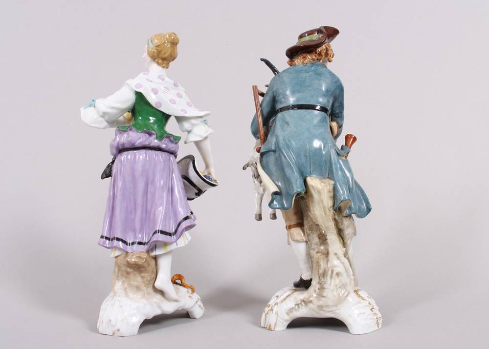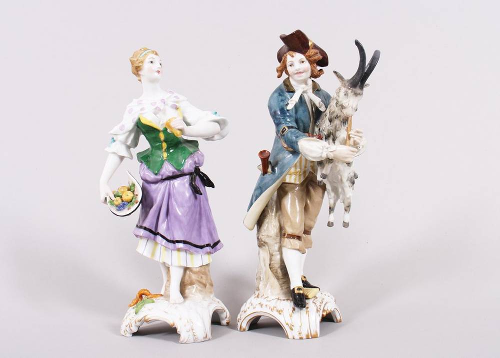 Porcelain, polychrome painted, a young shepherdess standing on a gilt-decorated three-legged base, carrying fruit in her hat, and a young shepherd holding a bagpipe in the shape of a goat. Each bears a blue scepter mark with a red imperial orb mark on the base. The shepherdess bears the year letter "X" for 1923, the shepherd the year letter "W" for 1922 and a month mark. Height approx. 22.5 cm. The shepherd's arms/hands and goat have been restored. Signs of age