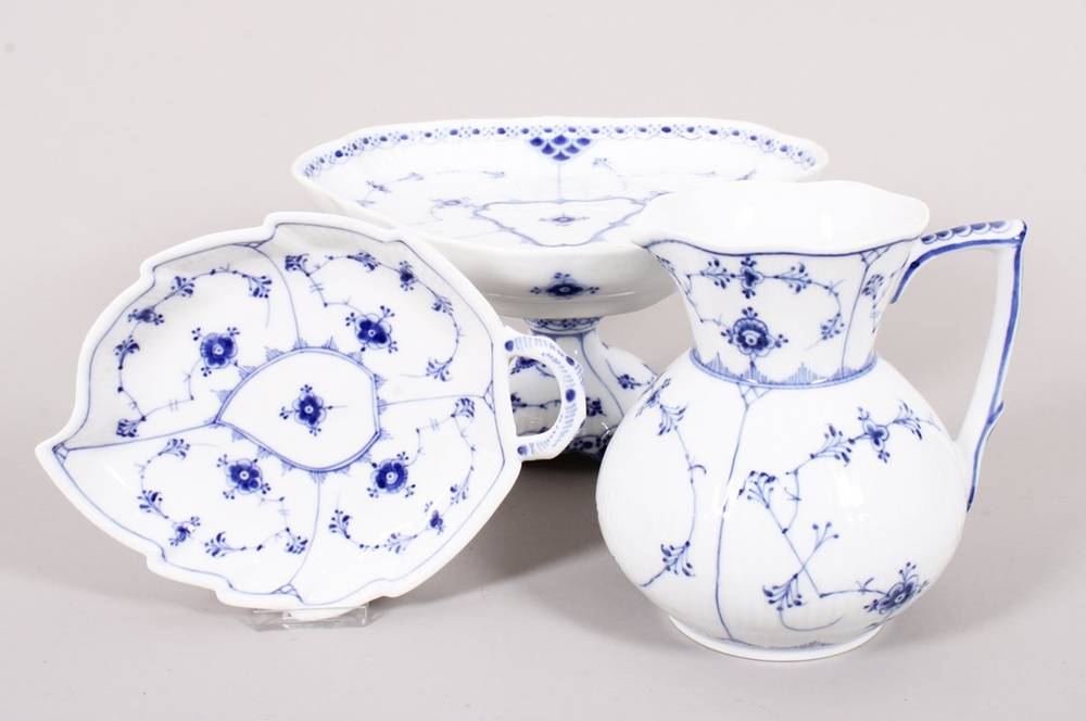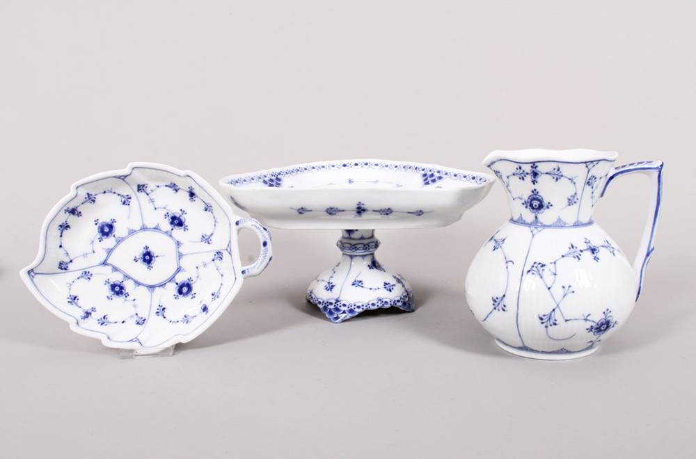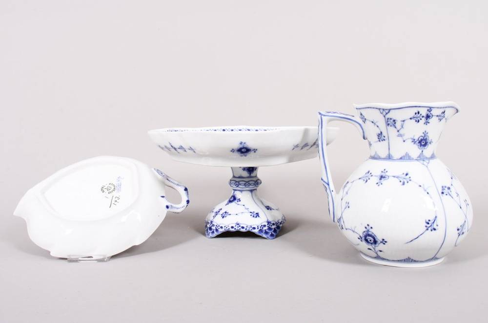 Porcelain, painted blue underglaze, consisting of a square footed bowl (model no. I/513) (minimal chip on the base), a large water jug ​​(small hairline crack inside the body), and a small leaf-shaped bowl (model no. "I/143"), each with a green manufacturer's mark and a blue wave mark on the base (leaf-shaped bowl and jug have a single ground-through mark), height (jug) 15 cm, height approx. 12.5 cm, minor signs of wear