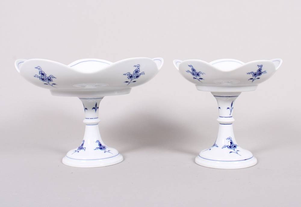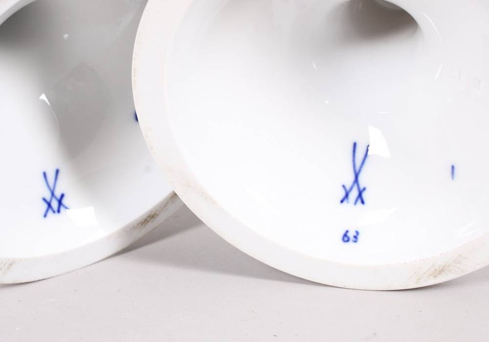 Porcelain, painted blue underglaze, each with a narrow stem and knop on a round foot, topped with a scalloped bowl, the center of each bowl decorated with the onion pattern, floral ornamentation on the foot and outer wall of the bowl, underglaze blue crossed swords mark as well as impressed and painter's numbers on the base, underside of the bowls and in the decoration, heights 14 and 14.5 cm, minor signs of wear