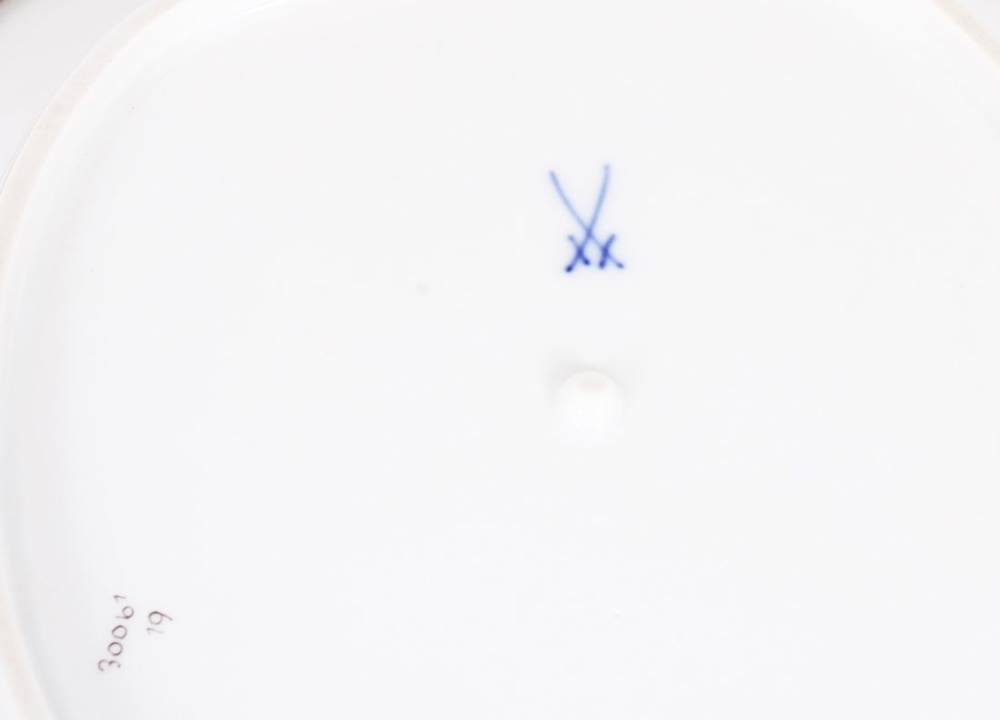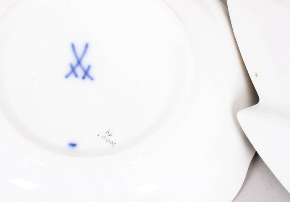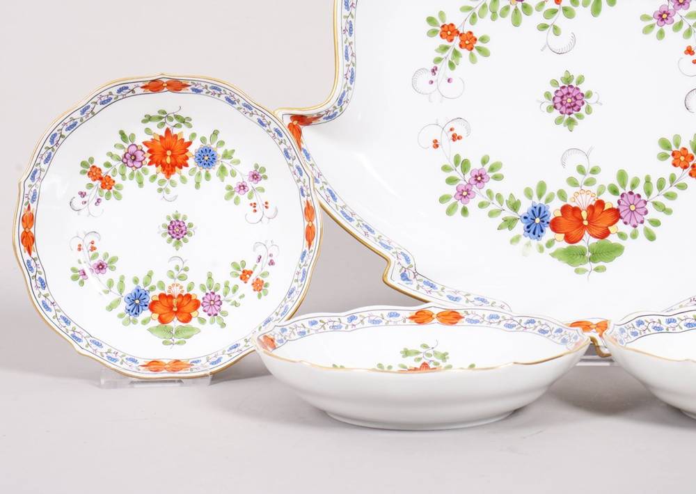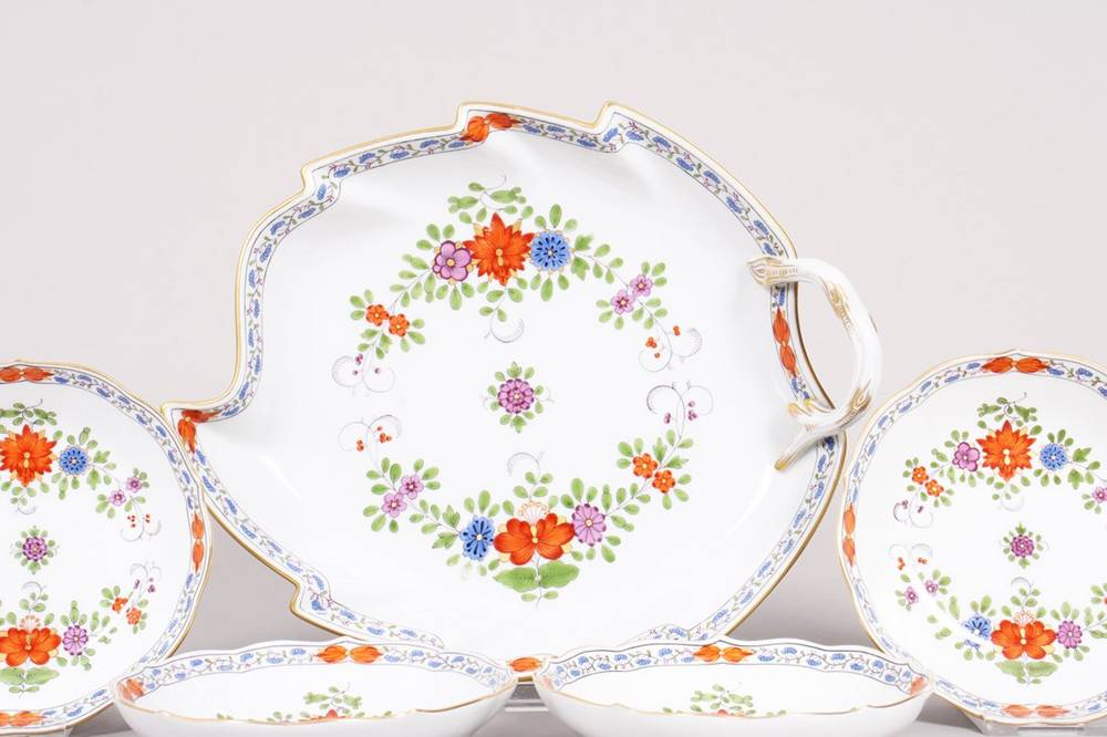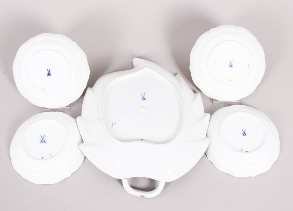Porzellan, polychrom bemalt, mit Goldrand, große Blattschale mit astförmigem Griff, sowie 4 kleine Schälchen (eigentlich Mokka-Untertassen), jeweils mit reichhaltigem Floraldekor verziert, im Boden jeweils unterglasurblaue Schwertermarke, Press- und Malernummern, B (Blattschale) 22,5cm, D (Schälchen) 11cm, leichte Gebrauchsspuren
