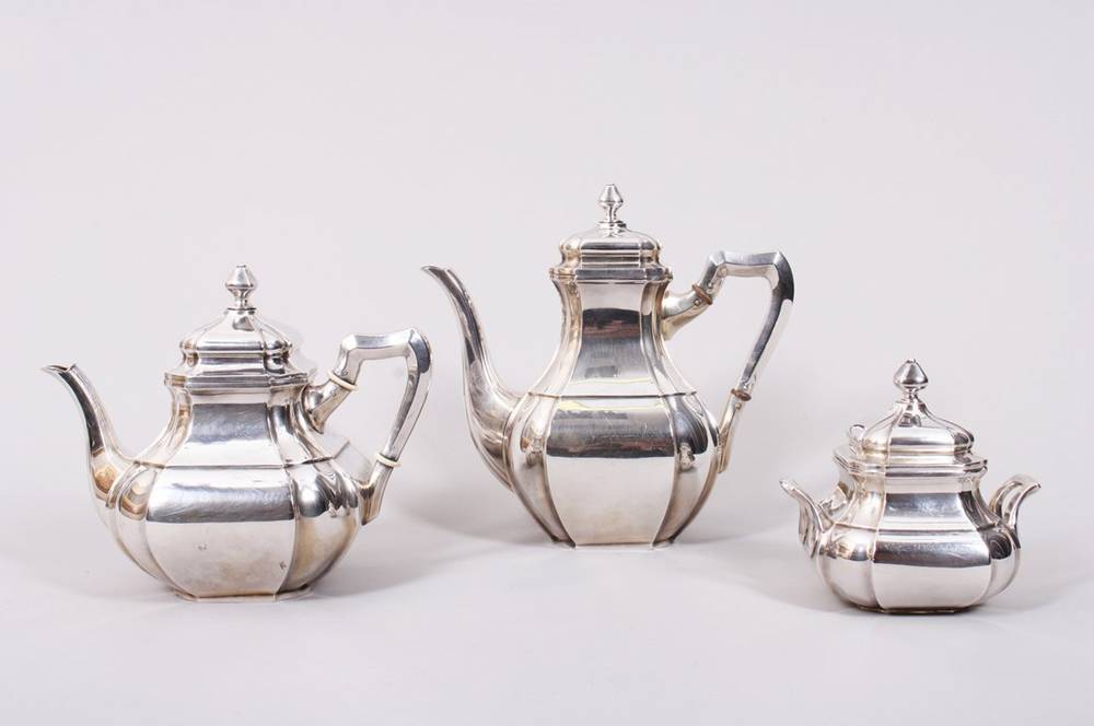 Teekanne, Kaffeekanne und Zuckerdose, 830er Silber, Gebrüder Deyhle, Schwäbisch Gmünd, Mitte 20.Jh.