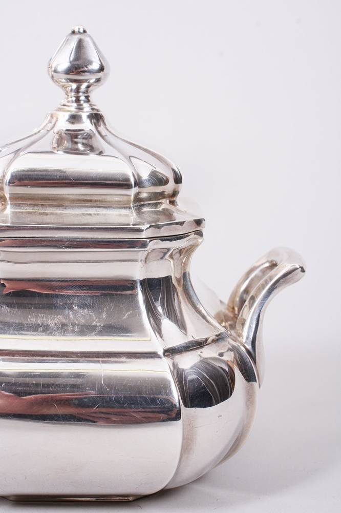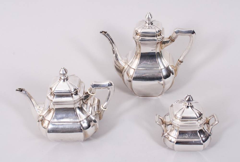 je eckiger Stand, bauchig aufsteigende 8-eckige Wandung und eingeschwungene Halszone, Kannen mit eckig aufschwingenden, profilierten Henkeln und schlanken Ausgüssen, Isolierringe aus Bein, Deckel mit Zapfenkäufen, zus. ca. 1324gr., H bis ca. 22,5cm, Gebrauchsspuren