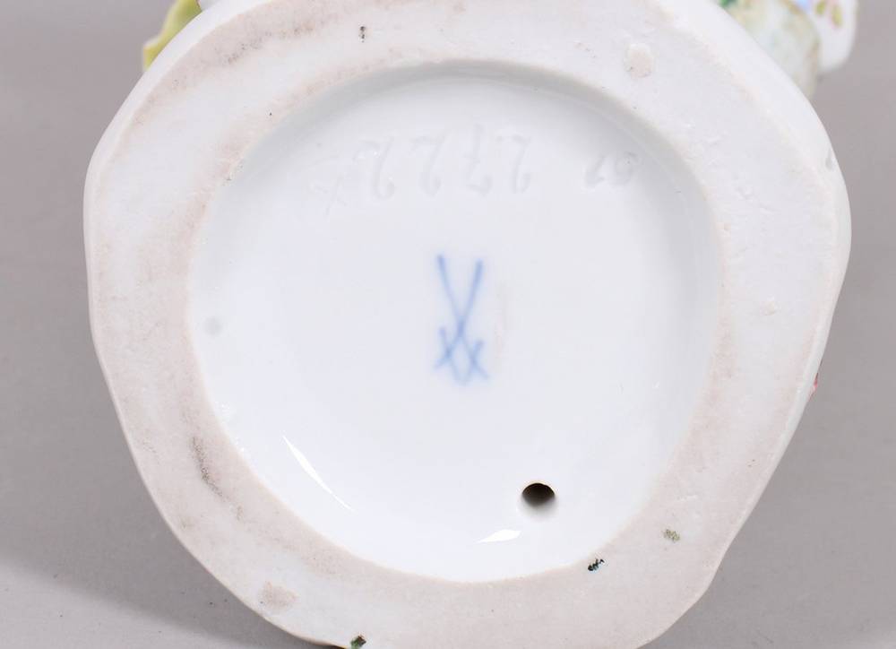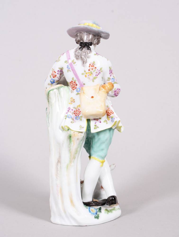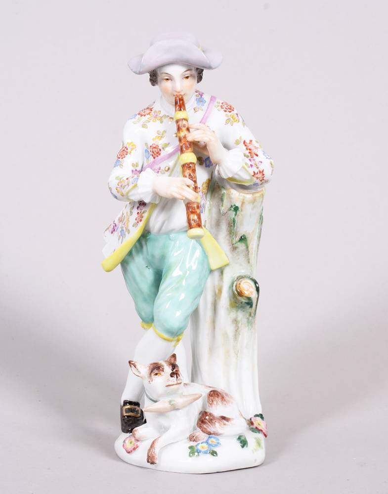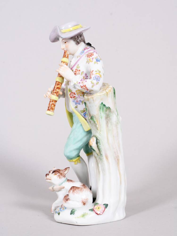 Porcelain, polychrome painted, on a tree trunk, a flute-playing shepherd in summer clothing, a dog lying at his feet, underglaze blue crossed swords mark (1 grinding mark) and model number "2722" on the base, height approx. 16 cm, slight signs of age, one index finger chipped