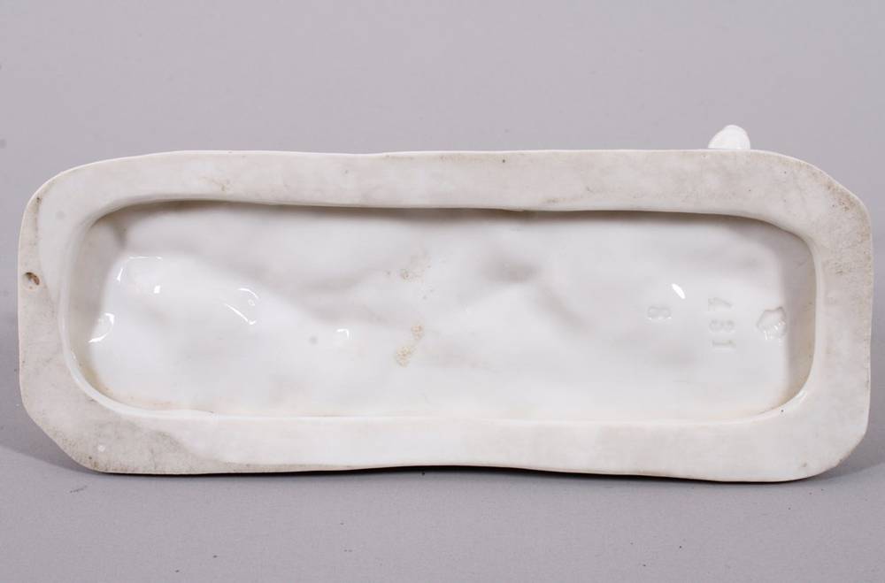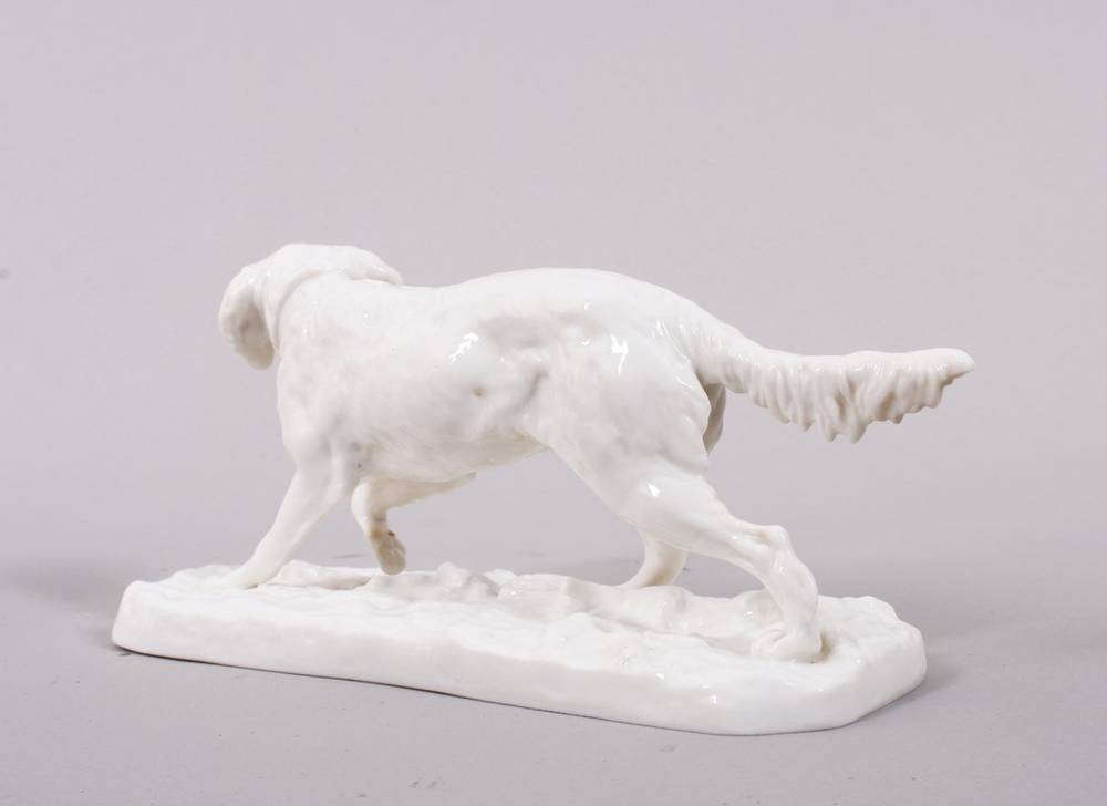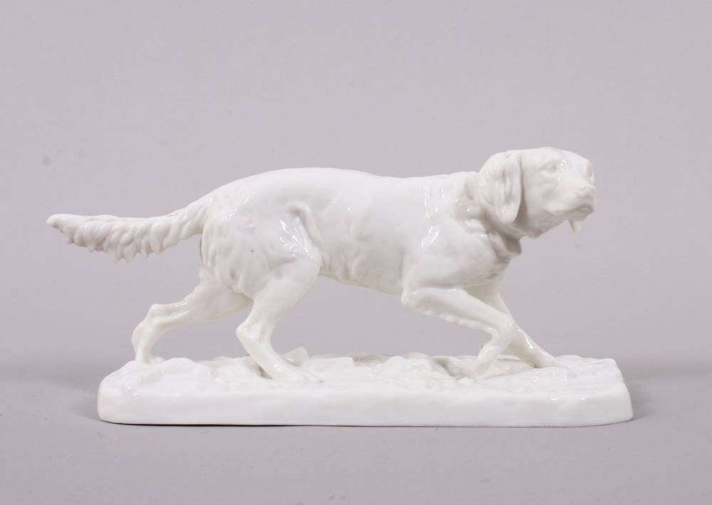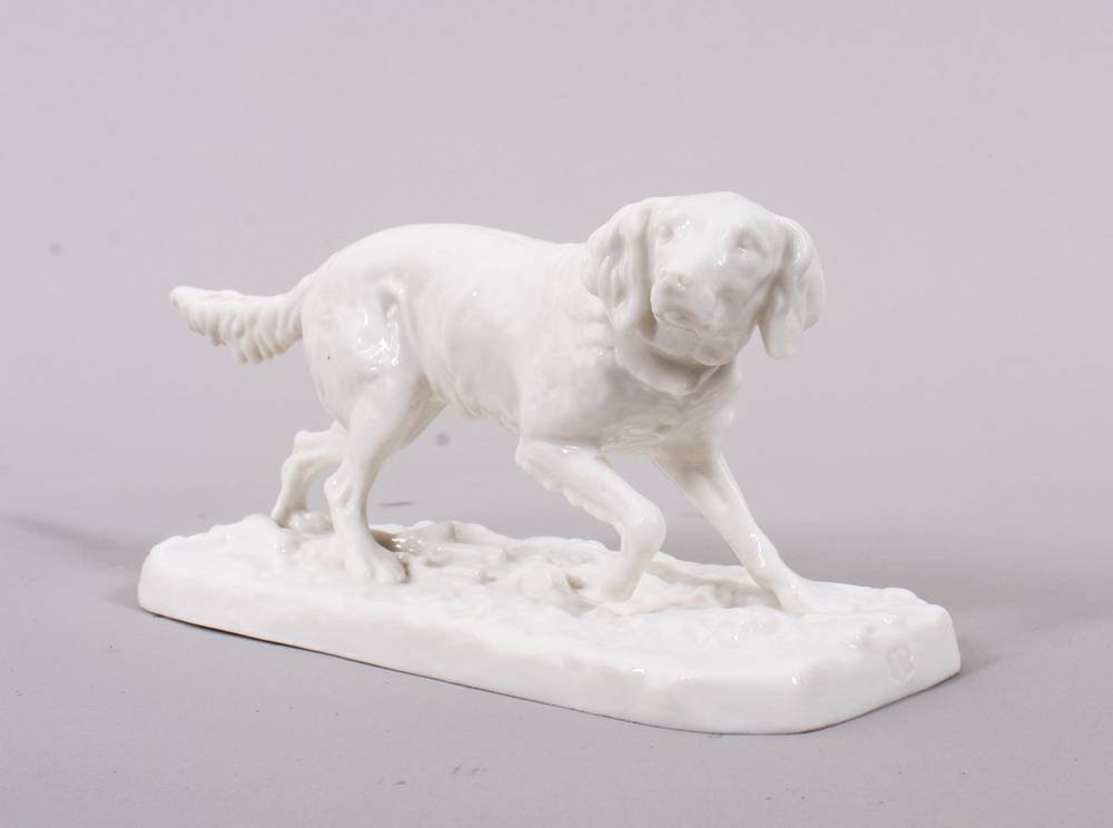 Weißporzellan, auf flachem Natursockel, schreitender Jagdhund, den Kopf nach rechts gewandt, auf Sockel und im Boden Manufakturmarke als Pressmarke sowie num. "431 8", L 19cm, geringe Altersspuren