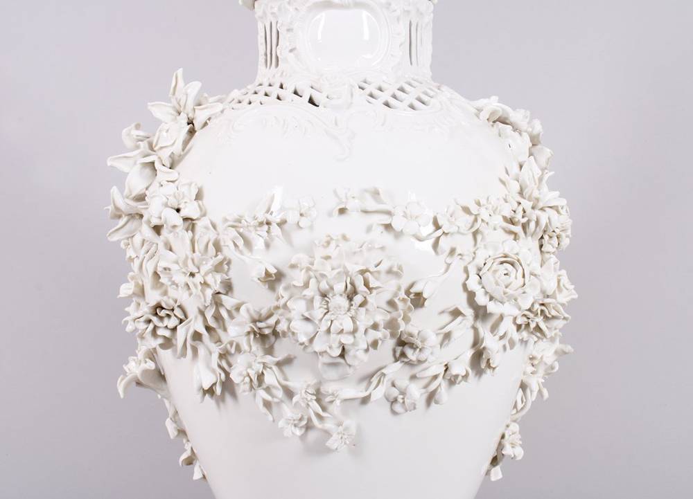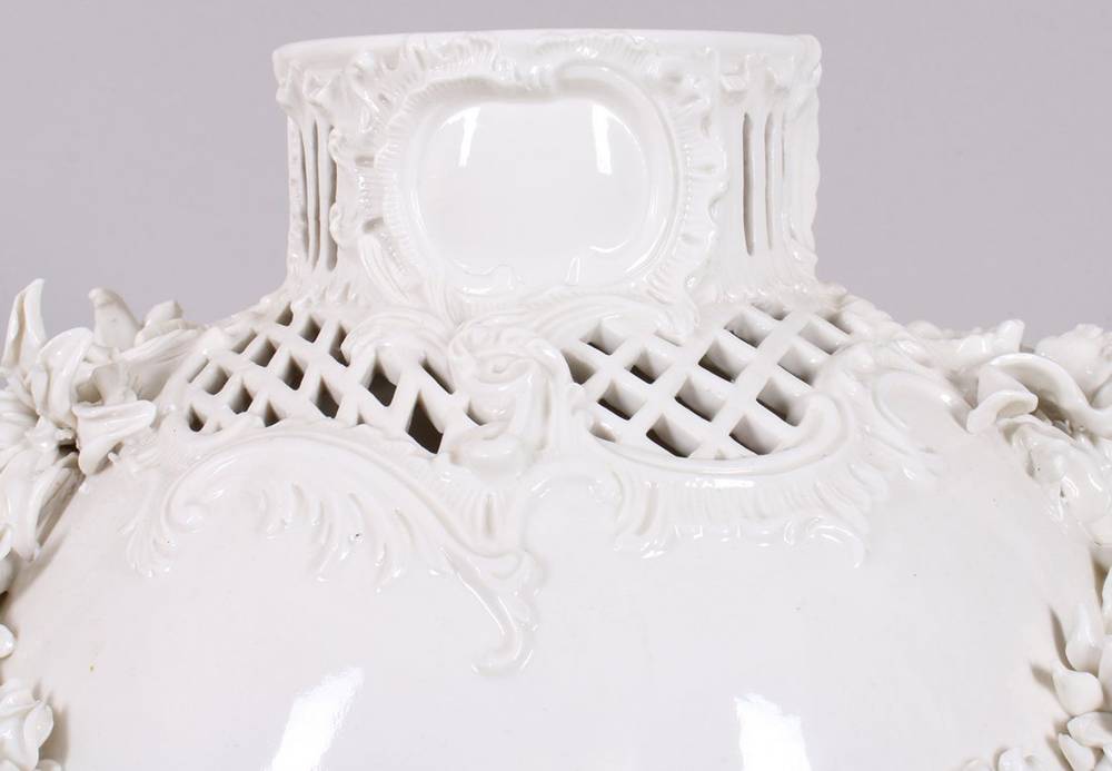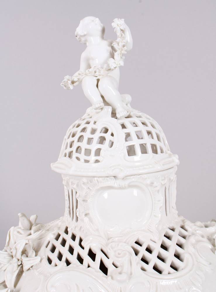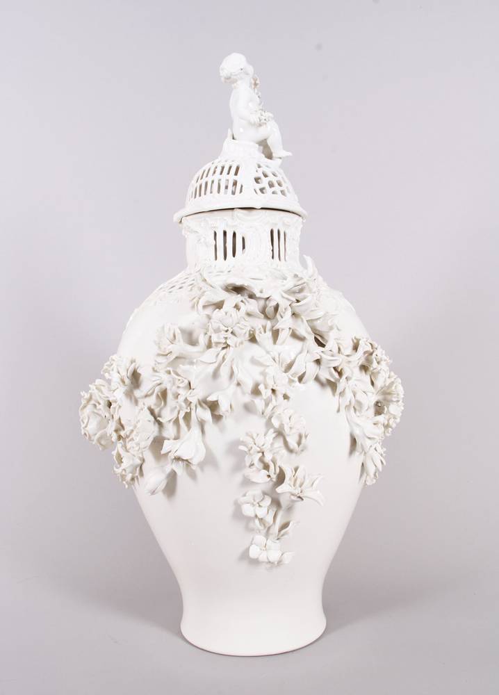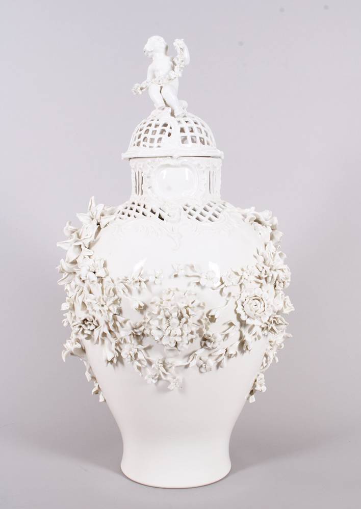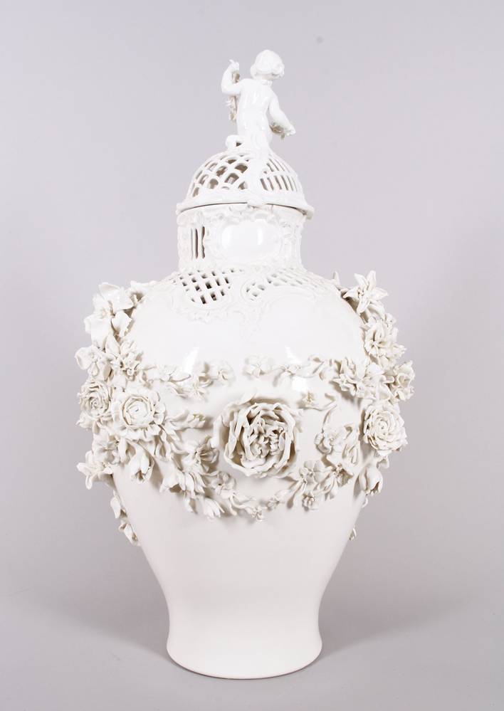 Weißporzellan, auf rundem Stand, ovoider Korpus, Schulter und Hals gitterförmig durchbrochen, korrespondierender, gewölbter Deckel, bekrönt von Amorette mit Blütengirlande, auf der Wandung umlaufend aufgelegte Blüten und Blätter, im Boden grüne Manufakturmarke, Manufakturmarke als Pressmarke sowie num. "881 3", H ca. 60cm, leichte Altersspuren, einige Blätter bestoßen, Bruckstücke tlw. vorhanden