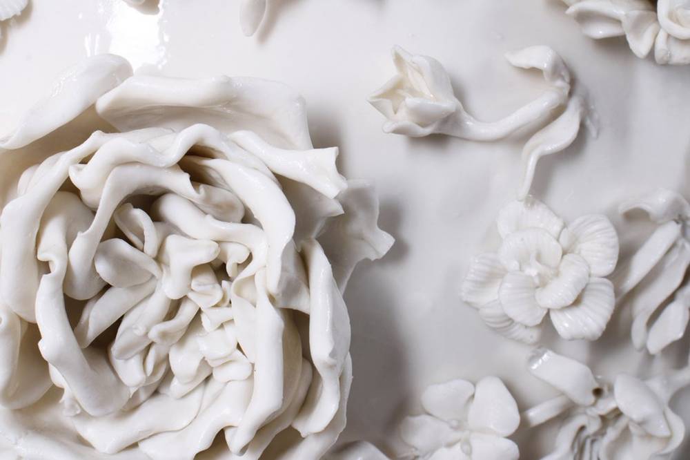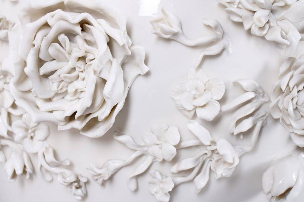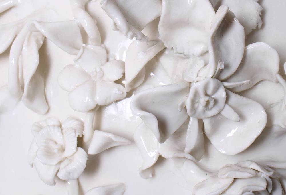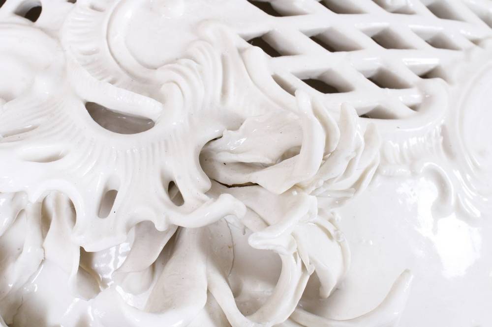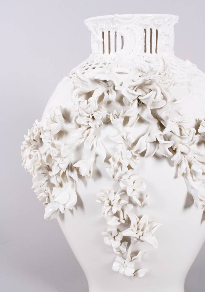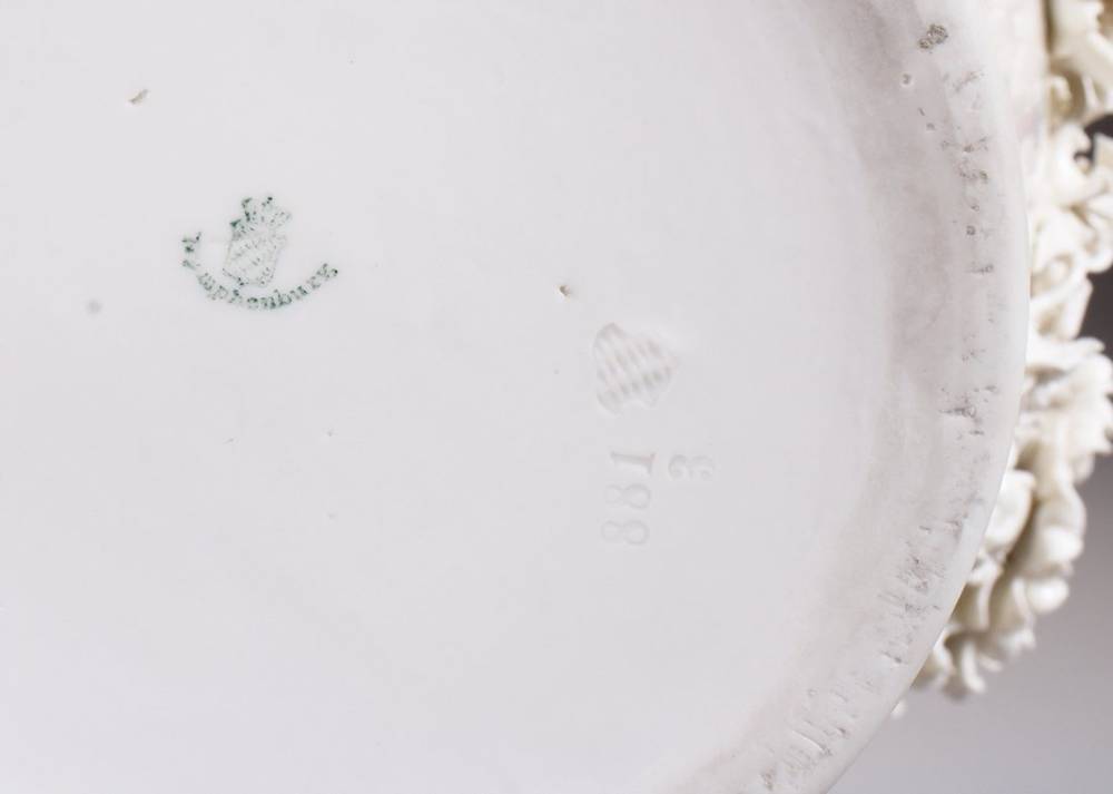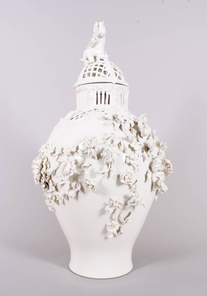 Weißporzellan, auf rundem Stand, ovoider Korpus, Schulter und Hals gitterförmig durchbrochen, korrespondierender, gewölbter Deckel, bekrönt von Amorette mit Blütengirlande, auf der Wandung umlaufend aufgelegte Blüten und Blätter, im Boden grüne Manufakturmarke, Manufakturmarke als Pressmarke sowie num. "881 3", H ca. 60cm, leichte Altersspuren, einige Blätter bestoßen, Bruckstücke tlw. vorhanden