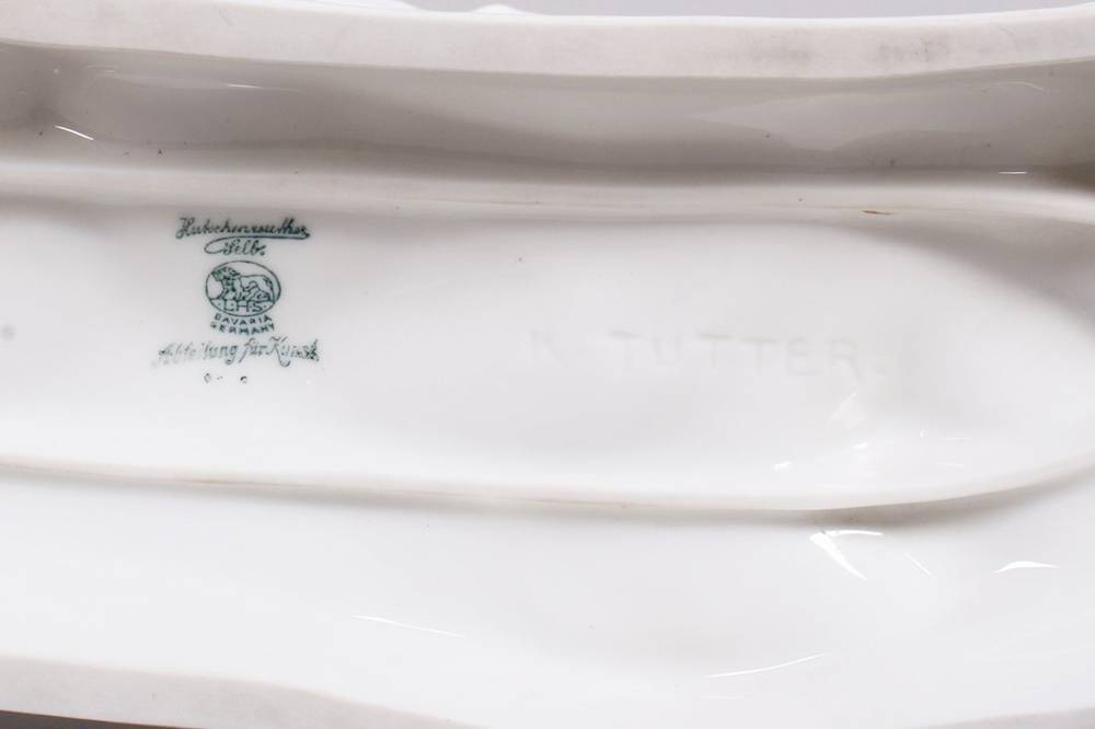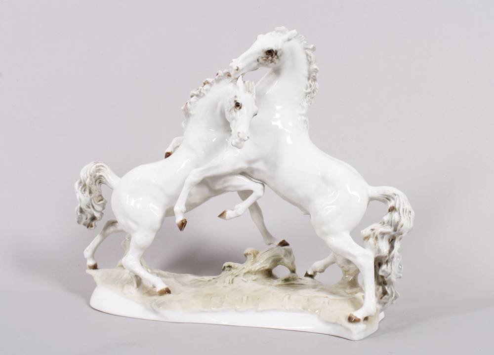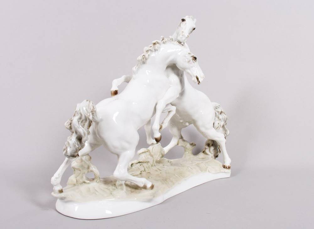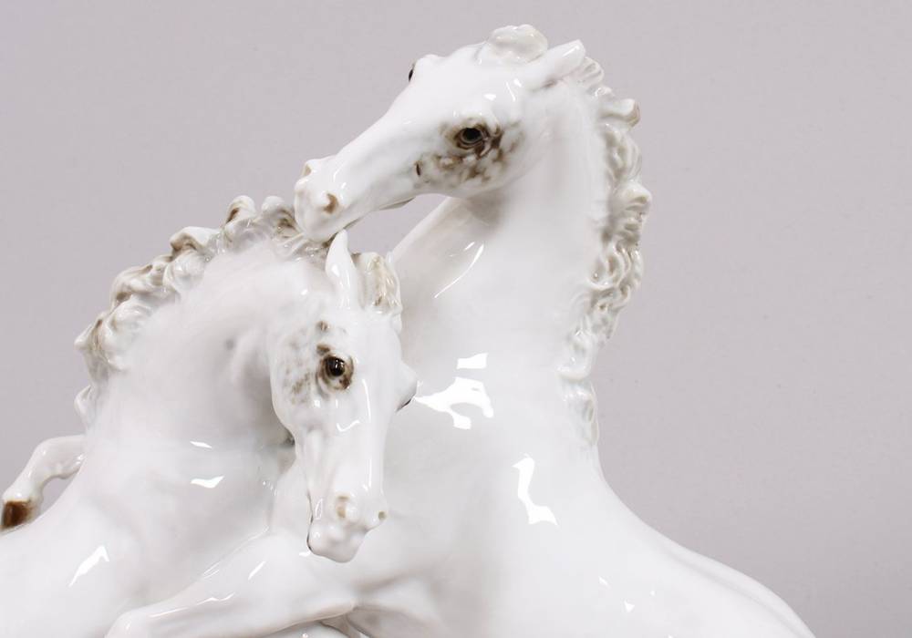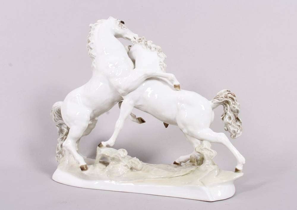 Porzellan, farbig staffiert, auf naturalistischem Sockel zwei einander zugewandte steigende Schimmel, im Boden unterglasurgrüne Manufaktur-Löwenmarke (Hutschenreuther Selb - Abteilung für Kunst) sowie geritzte Signatur "K. TUTTER.", H ca. 27cm, B ca. 34cm, Ohren eines Pferdes bestoßen