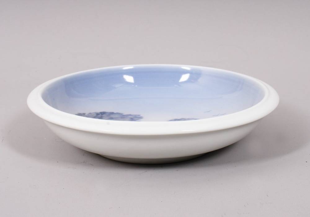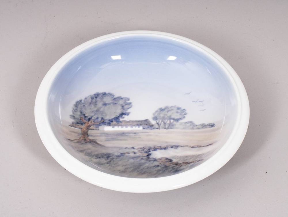 Porzellan, polychrom bemalt, massive Schale, tief gemuldete Form, im Spiegel Landschaftsdarstellung mit Gehöft umgeben von Bäumen, im Boden unterglasurblaue Manufakturmarke sowie Modellnummer "2904-2528", ein Schleifstrich, D 21,5cm, minimalste Gebrauchsspuren