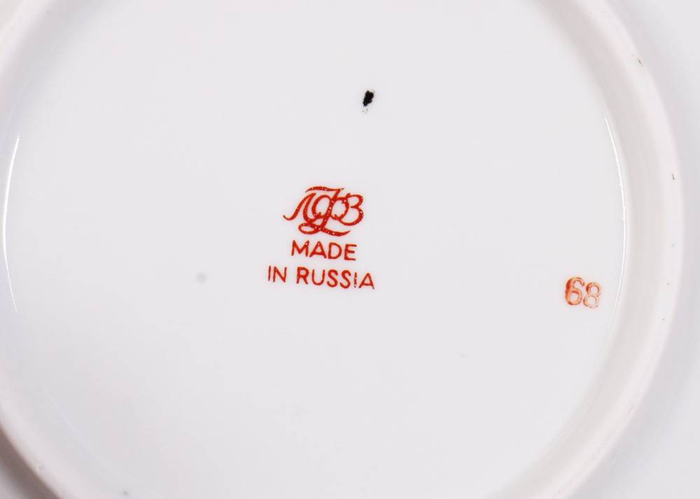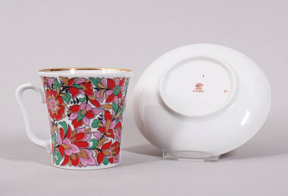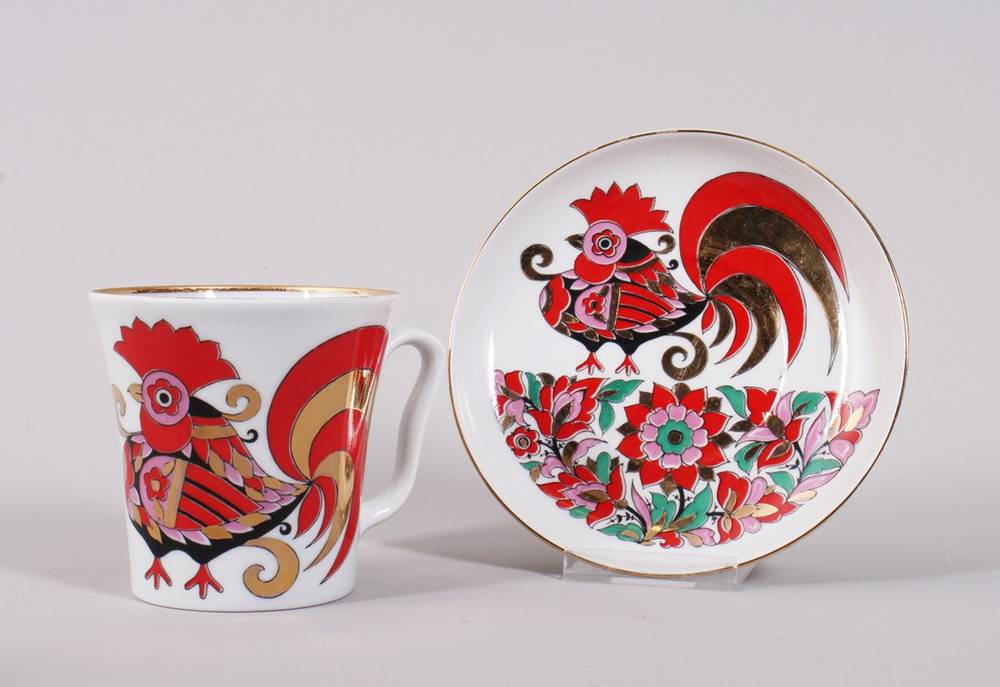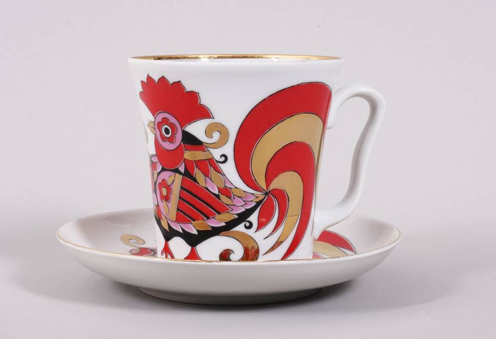 Teebecher mit Untertasse, Lomonosov, Russland, Form "Leningradski", Dekor "Roter Hahn", 20.Jh.
