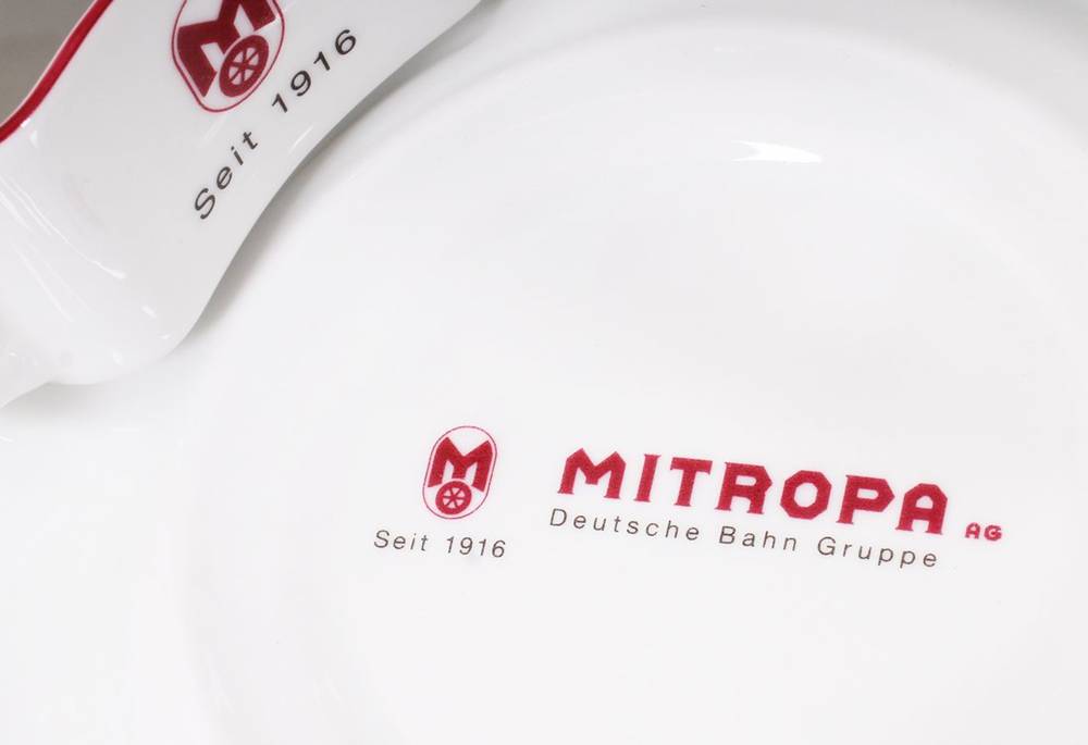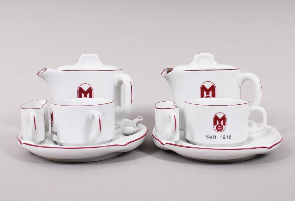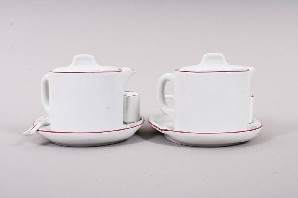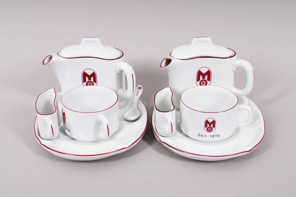 Porzellan, auf ovalem Tablett, zylindrische Kaffeetasse und Löffel sowie gebogte Kanne und Sahnegießer, Karminrote Ränder, schauseitig "Mitropa"-Logo und bez. "Seit 1916", im Boden Fabrikmarke, H ca- 11cm (Kanne), geringe Gebrauchsspuren, 1 Löffel fehlt