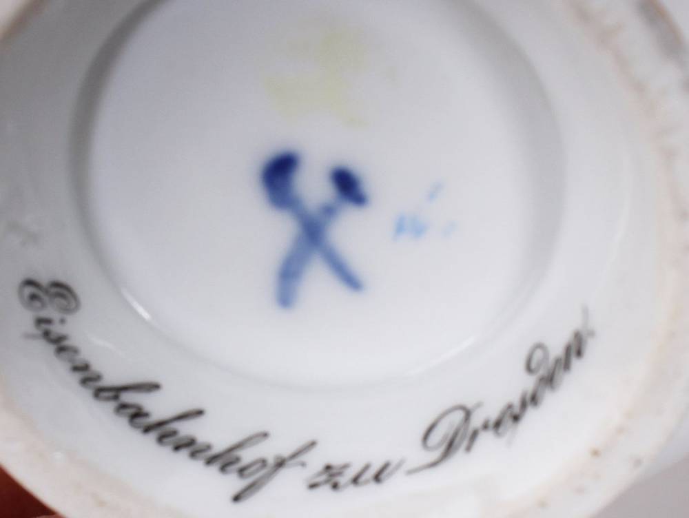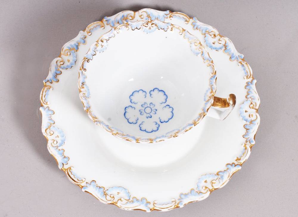 Porzellan, polychrom und gold bemalt, auf rundem Standring, konisch ansteigender Korpus, seitlich J-Henkel, schauseitig Ansicht des Leipziger Bahnhofs in Dresden, Innenrand mit reliefiertem Rocaille- und Blattfries, korrespondierende UT, im Boden unterglasurblaue Schwertermarke und Titel, H ca. 6,5cm (Tasse), D ca. 16cm (UT), Henkel restauriert/ geklebt, Altersspuren, Gold berieben