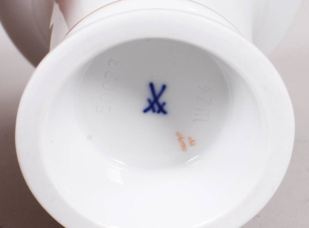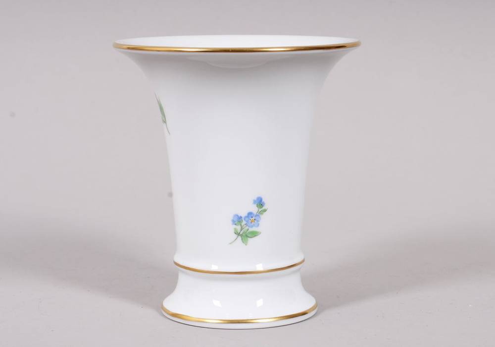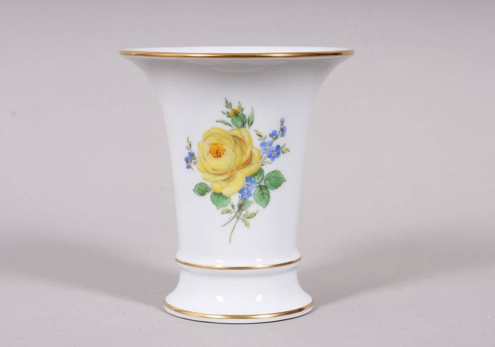 Porzellan, polychrom bemalt, mit Goldrändern und -bändern, konischer Korpus mit weit ausgestelltem Lippenrand, schauseitig mit Blumenbouquet, umlaufend mit gestreuten Blümchen, im Boden unterglasurblaue Schwertermarke sowie 5-stellige Pressnummer, H ca. 9,5cm, leichte Gebrauchsspuren