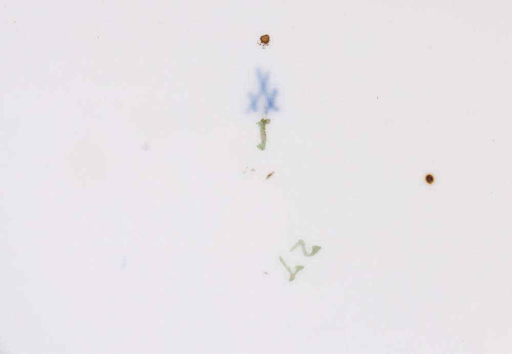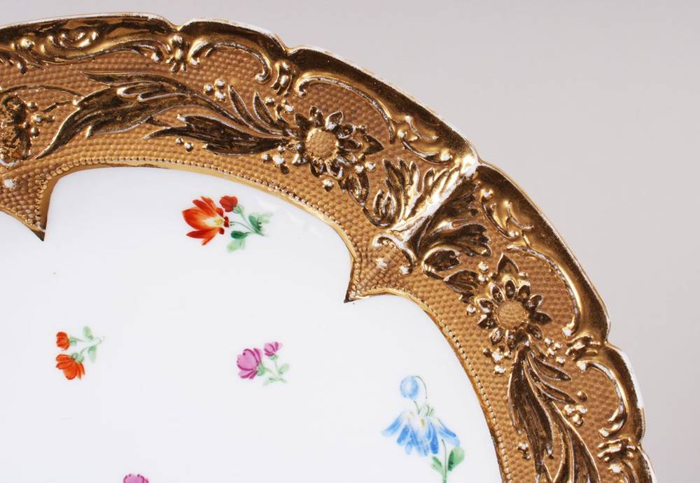 Porzellan, polychrom und gold bemalt, im Spiegel Streublümchendekor, auf Fahne und Anstieg reliefierter Floraldekor umgeben von Schlangenhautrelief mit radiertem und poliertem Golddekor, im Boden unterglasurblaue Schwertermarke und Maler-Nr. "27", D ca. 20,5cm, Alters- u. Gebrauchsspuren, Gold partiell berieben