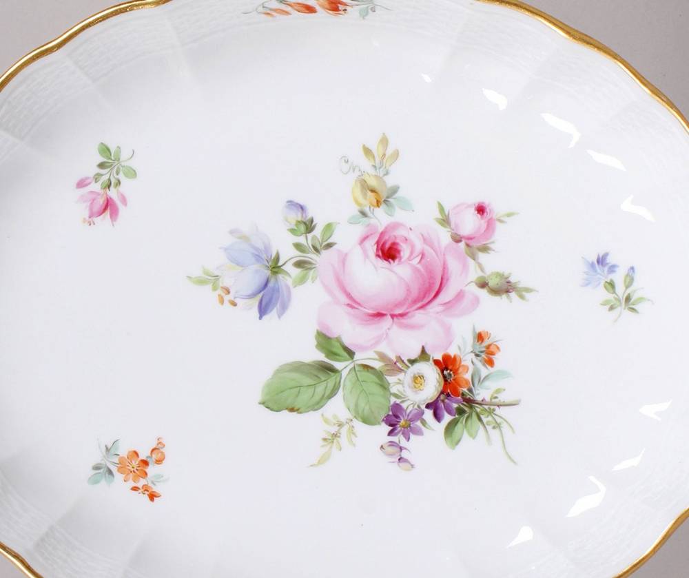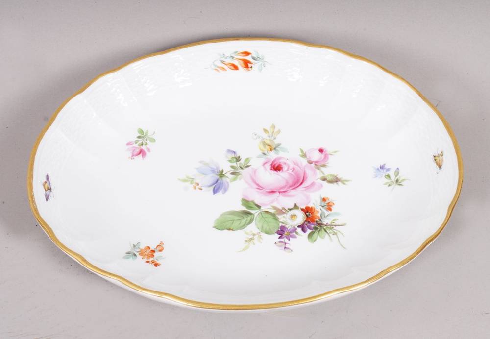 Porzellan, polychrom bemalt, Goldrand, Korbrandrelief, leicht gemuldete Schale mit Blumenbouquet und umlaufenden Streublümchen, auf Fahne Streublümchen- und Insektendekor, im Boden unterglasurblaue Schwertermarke sowie Pressnummern "4/128", L ca. 22,5cm, im Boden minimale Glasurfehler, leichte Gebrauchsspuren