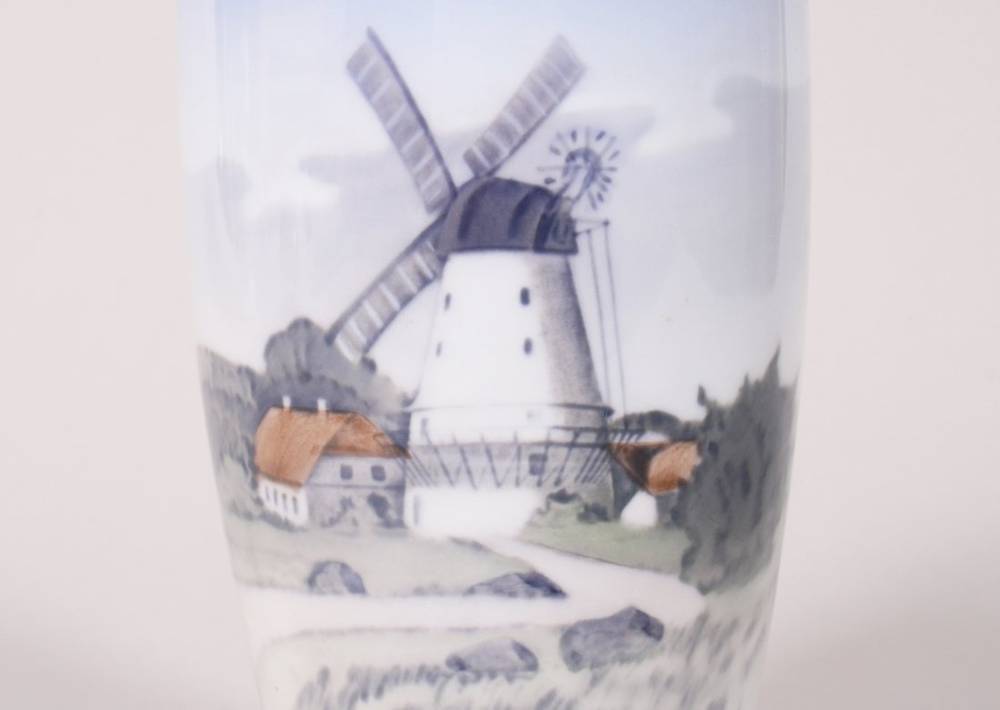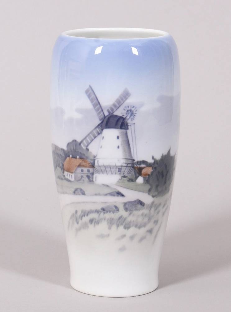 Porzellan, polychrome Unterglasurbemalung, ovoider Korpus mit weiter Mundung, schauseitig Darstellung der Düppeler Mühle bei Sønderborg, im Boden Manufakturmarke, Modell-Nr. "4568" sowie Malerzeichen, H ca. 17cm, Alters- u. Gebrauchsspuren