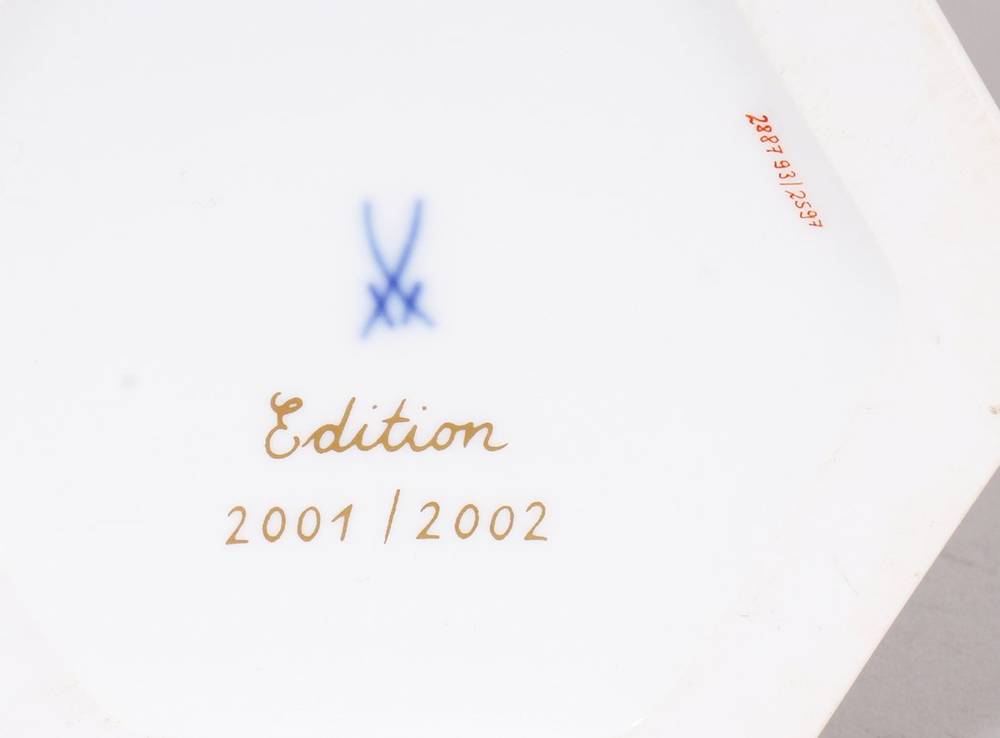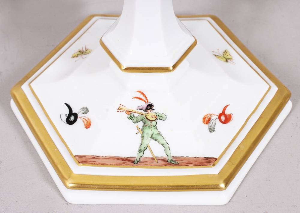 Porzellan, polychrom bemalt, Goldränder, auf polygonalem Stand vielfach getreppter Schaft mit Goldbändern verziert, auf dem Fuß Harlekin- und Maskenmotive mit Schmetterlingen aus der Commedia dell'arte, im Boden unterglasurblaue Schwertermarke sowie in gold bezeichnet "Edition 2001/2002" (Freunde des Meissener Porzellans - Club der Staatlichen Porzellan-Manufaktur Meissen), gepresste Modellnummer "53120", H ca. 14cm, leichte Gebrauchsspuren