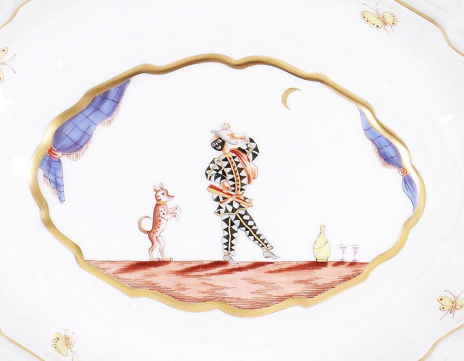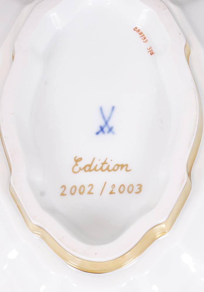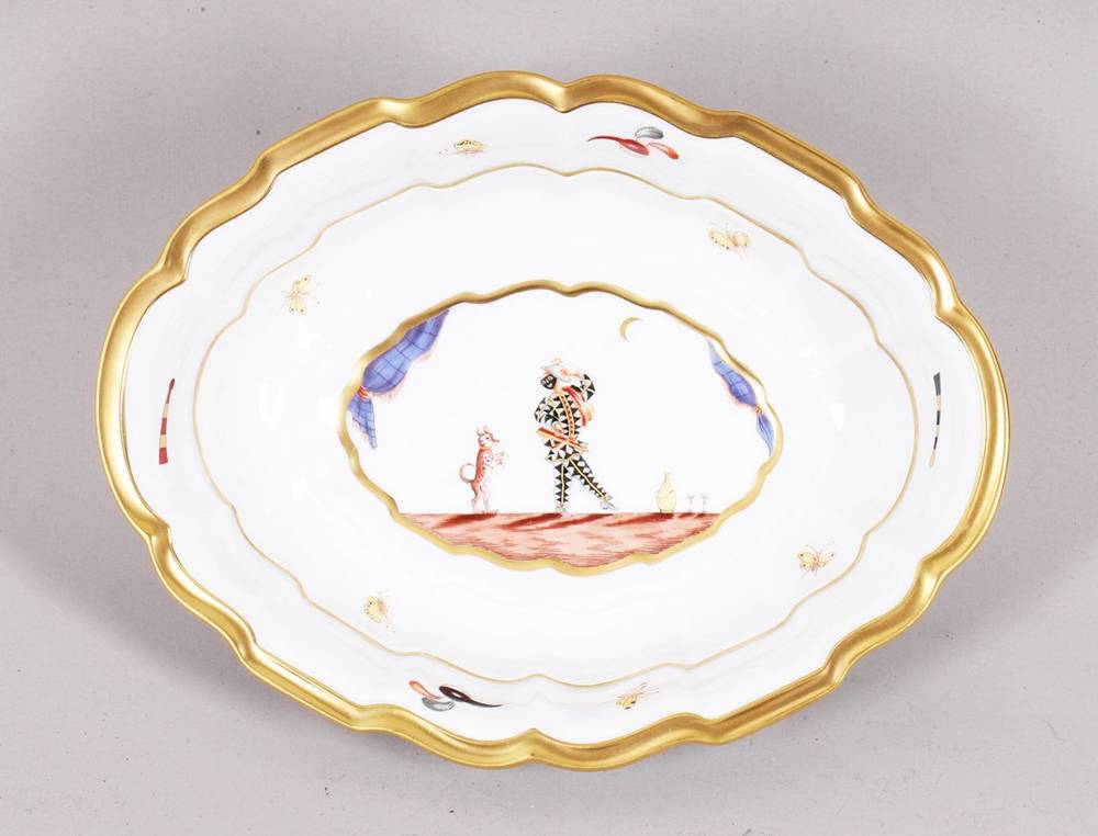 Porzellan, polychrom bemalt, Goldstaffage und -bänder, ovale Schale mit getreppter und bewegter Wandung, im Spiegel auf einer Bühne stehender Harlekin mit Hund und Weinkaraffe mit Gläsern, nach Figuren aus der Commedia dell'arte, auf innerer Wandung Schmetterlings- und Maskendekor, im Boden unterglasurblaue Schwertermarke sowie in gold bez. "Edition 2002/2003" (Freunde des Meissener Porzellans - Club der Staatlichen Porzellan-Manufaktur Meissen), gepresste Modellnummer "53632", L ca. 18,5cm, H 6cm, leichte Altersspuren