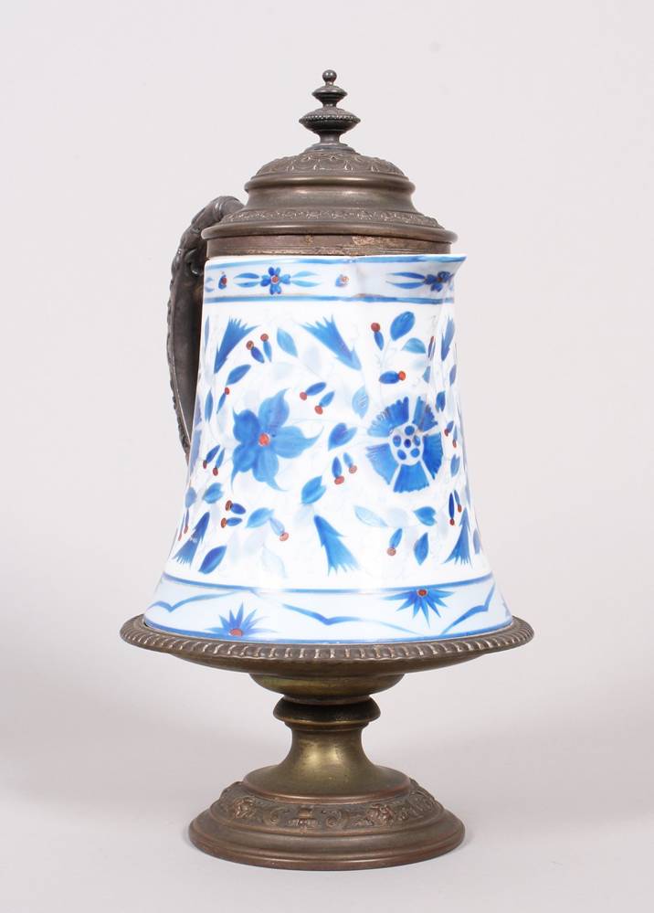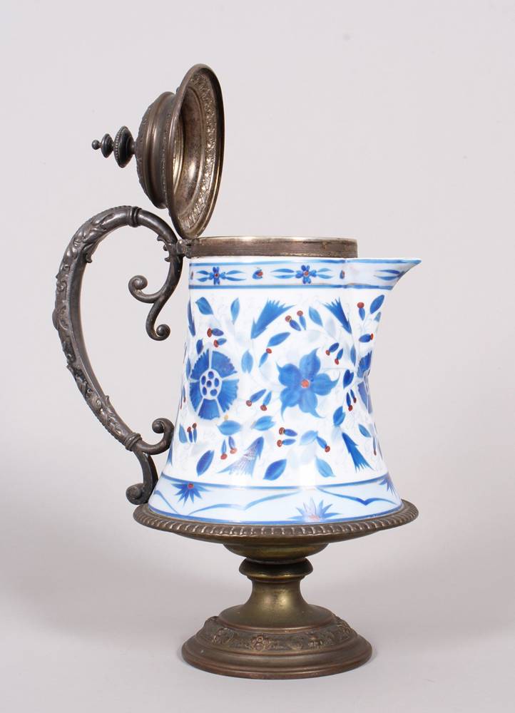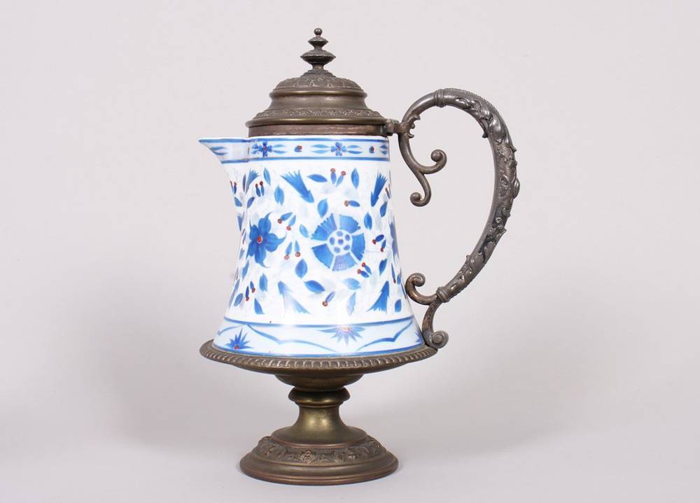 Messing/Porzellan, blau und eisenrot bemalt, auf tazzaförmigem Stand, konisch zulaufender Korpus mit kurzem Ausguss und montiertem Deckel und Henkel, auf der Wandung umlaufender Blumendekor, ungemarkt, H ca. 27,5cm, Alters- u. Gebrauchsspuren
