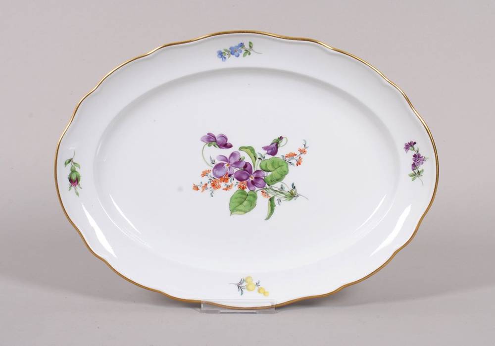 Porzellan, polychrom bemalt, mit Goldrand, ovale kleine Platte mit bewegtem Rand, im Spiegel Blumenbouquet, auf Fahne Streublümchen, im Boden unterglasurblaue Schwertermarke (2-fach durchschliffen) sowie Pressnummern, L ca. 29,5cm, leichte Gebrauchsspuren