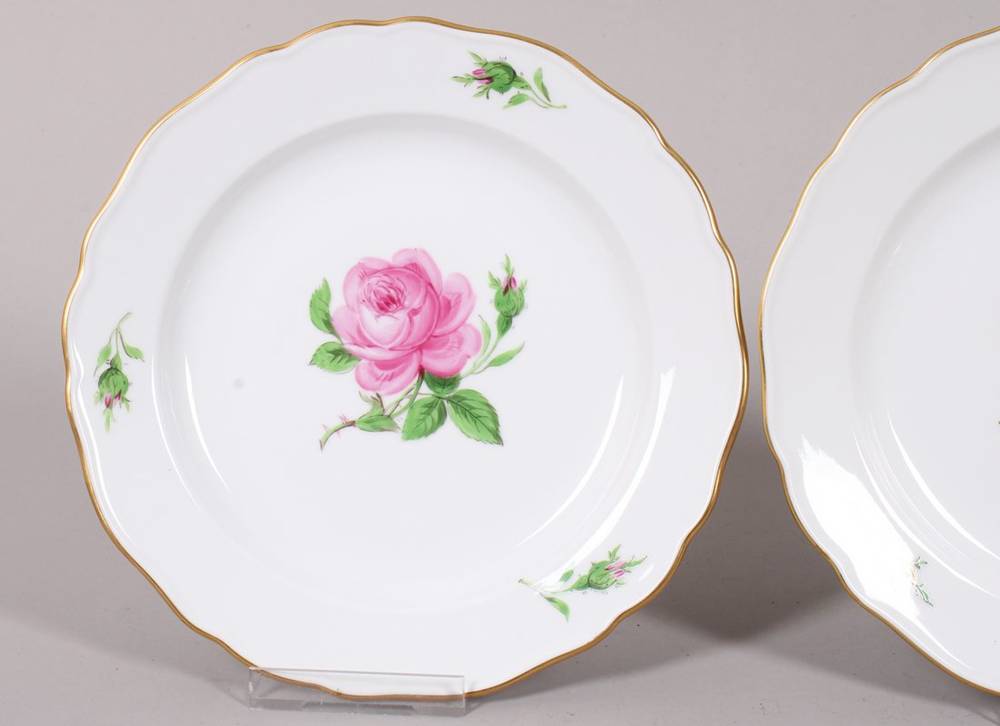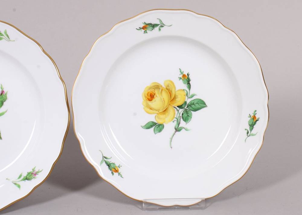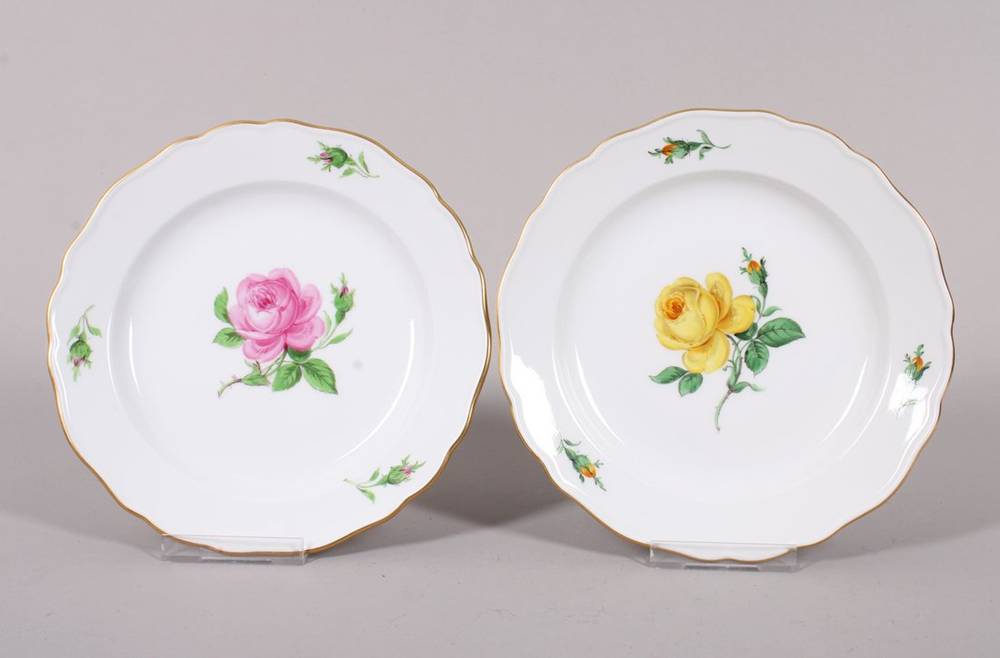 Porzellan, polychrom bemalt, mit Goldrand, zwei Gedeckteller mit Rosendekor in gelb bzw. rot, auf Fahne korrespondierende Blütenknospen, im Boden jeweils unterglasurblaue Schwertermarke, Press- und Malernummern, D ca. 18,5cm, rückseitig jeweils geklebter Haken, leichte Gebrauchsspuren