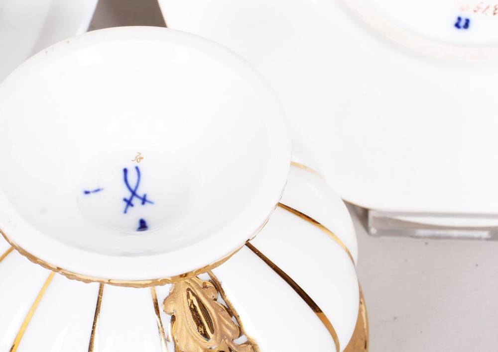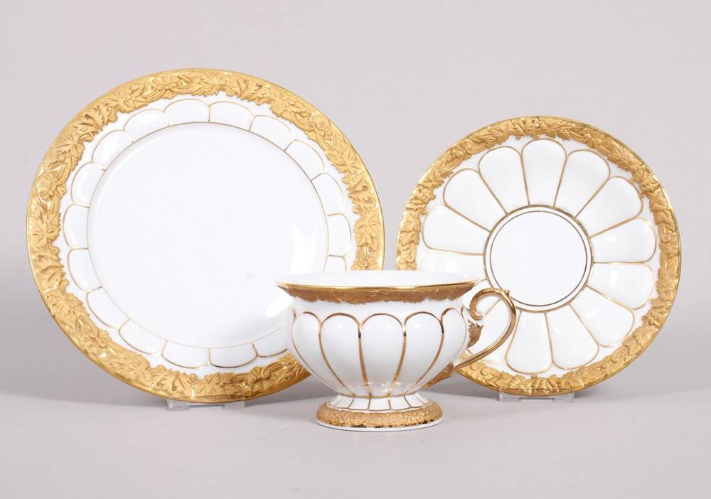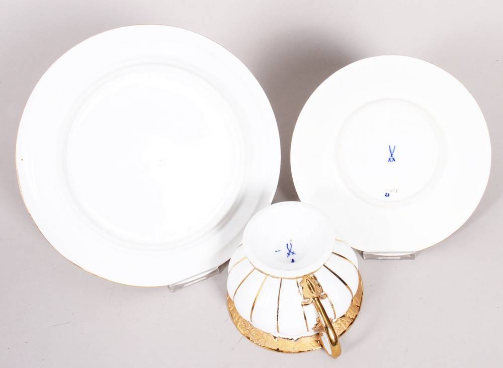 Porzellan, mit Matt- und Glanzgold bemalt, Gedeckteller mit korrespondierender Tasse und Untertasse, Ränder mit umlaufendem Blatt- und Rocailledekor, im Boden je unterglasurblaue Schwertermarke (Teller 1924-34) sowie Press- und Malernummern, Schwerter je zweifach durchschliffen, D (Teller) ca. 19,5cm, H (Tasse) 7cm, Gebrauchsspuren, minimaler Goldberieb