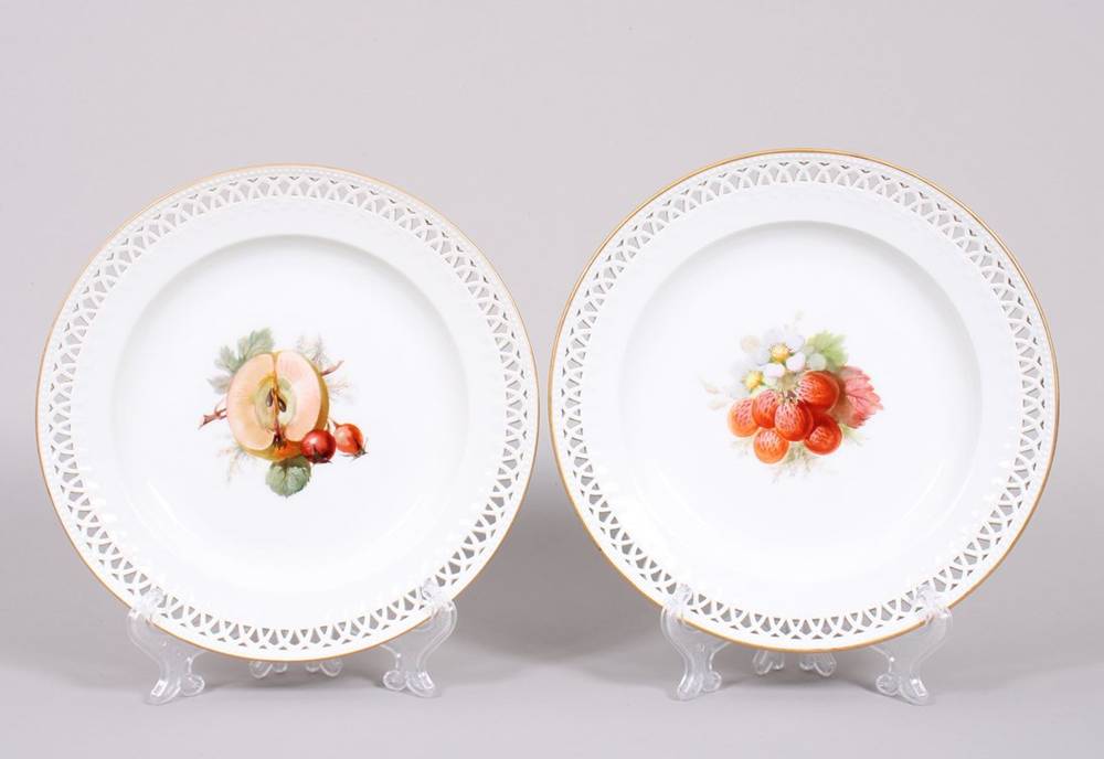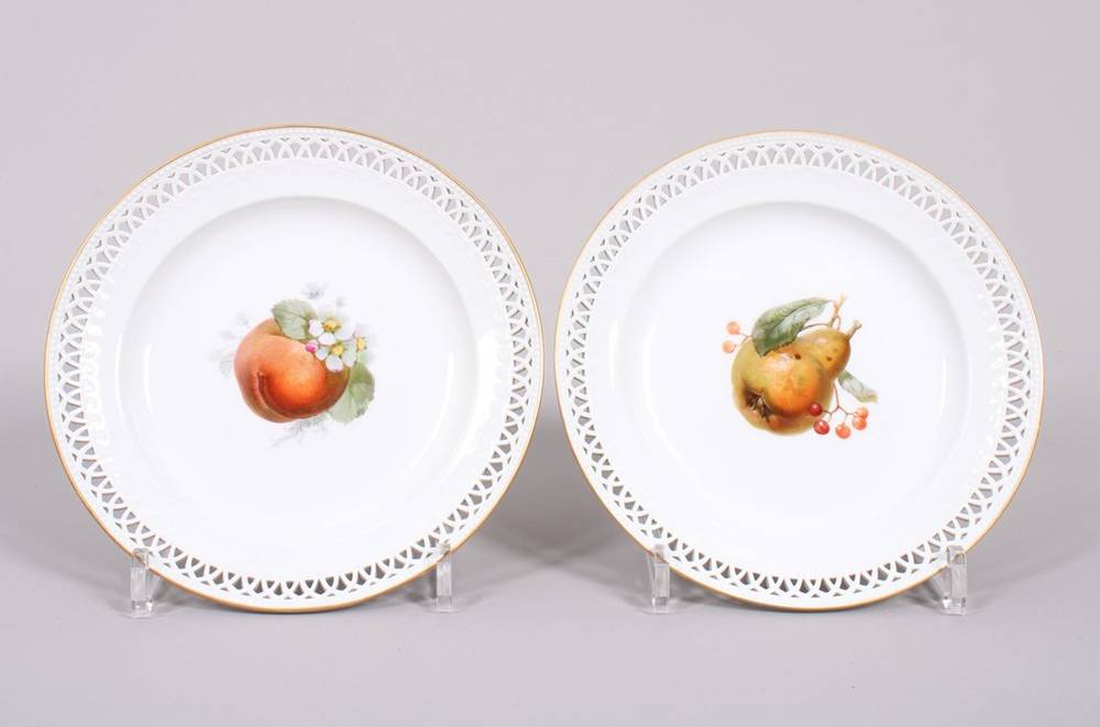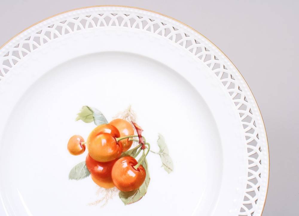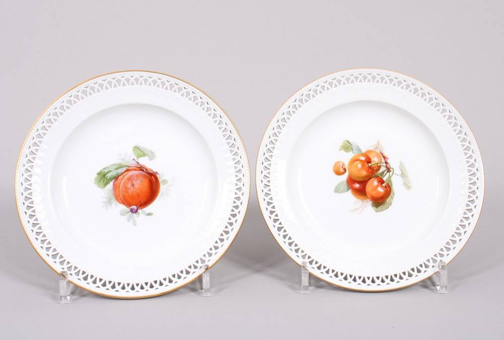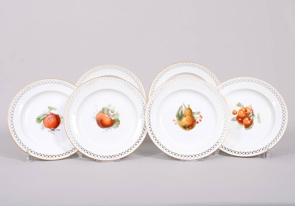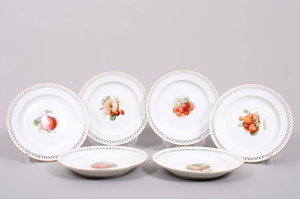 Porzellan, polychrom bemalt, mit Goldrand, sechs Teller in leicht gemuldeter Form mit halb durchbrochener Fahne, im Spiegel fein gemalte variierende Früchtedekore, im Boden je unterglasurblaue Zeptermarke, teils mit Bez. "GERMANY" sowie rote Reichsapfelmarke, Jahresbuchstaben "K" für 1910 und "L" für 1911, (ohne) Modellnummer "1054", D 22 cm, sehr leichte Altersspuren/ Gebrauchsspuren