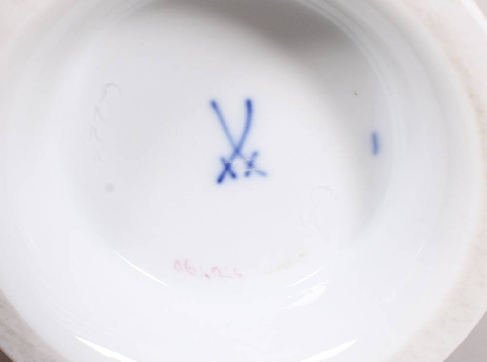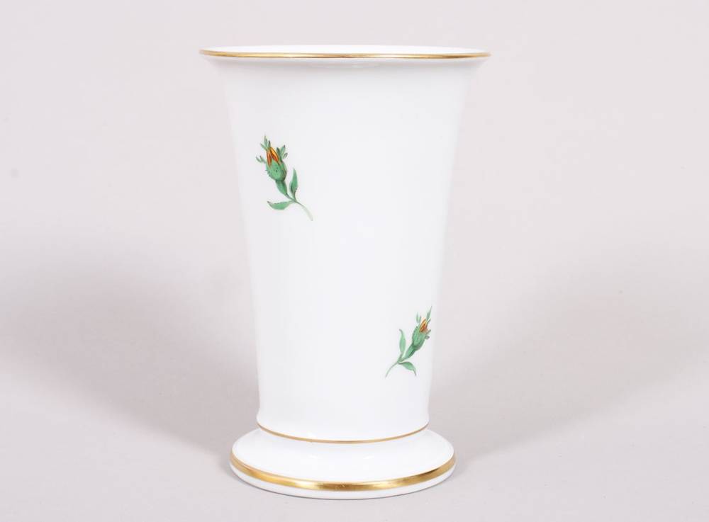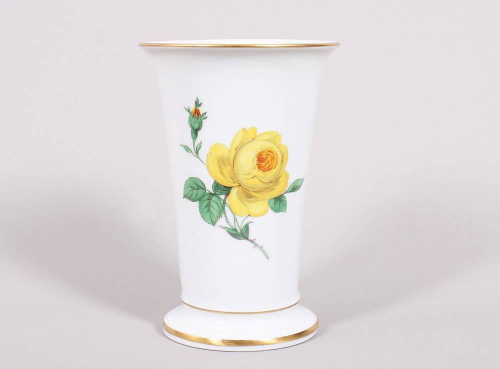 Porzellan, polychrom bemalt, mit Goldrändern und -bänder, auf rundem Fuß konischer Korpus mit leicht ausgestelltem Rand, schauseitig große gelbe Rose mit umlaufenden Rosenknospen, im Boden unterglasurblaue Schwertermarke (2-fach durchschliffen) mit Pressnummern, H ca. 13cm, leichte Gebrauchsspuren im Korpusinneren