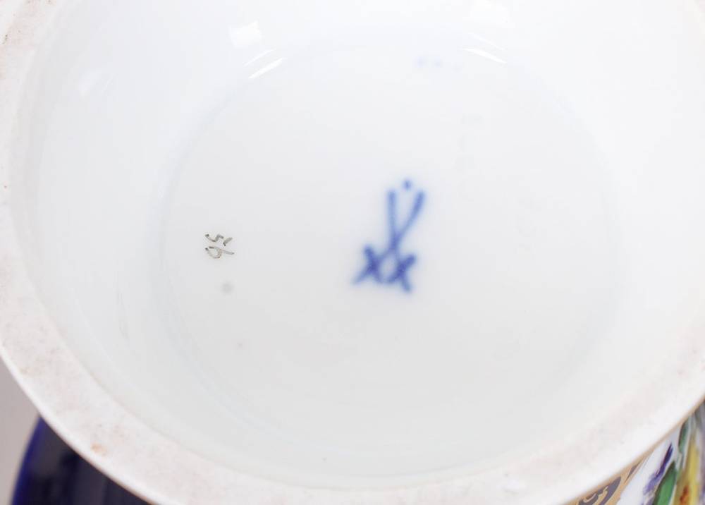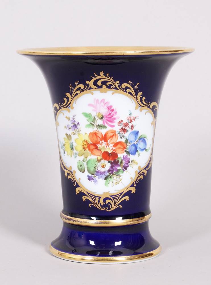 Porzellan, polychrom bemalt, mit Goldbändern und -rändern, auf rundem leicht eingezogenem Stand konischer Korpus mit weitem Lippenrand, umlaufend kobaltblauer Fond, schauseitig rocaillegerahmtes Medaillon in Gold, darin üppiges Blumenbouquet auf weißem Grund, im Boden unterglasurblaue Schwertermarke sowie Press- und Malernummern, H 13,5cm, leichte Gebrauchsspuren, mittleres Goldband stärker berieben, im Korpusinneren drei kleine Brandfehler