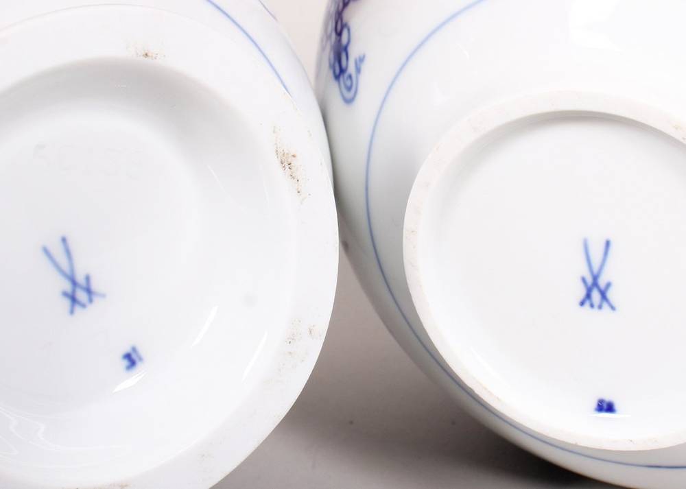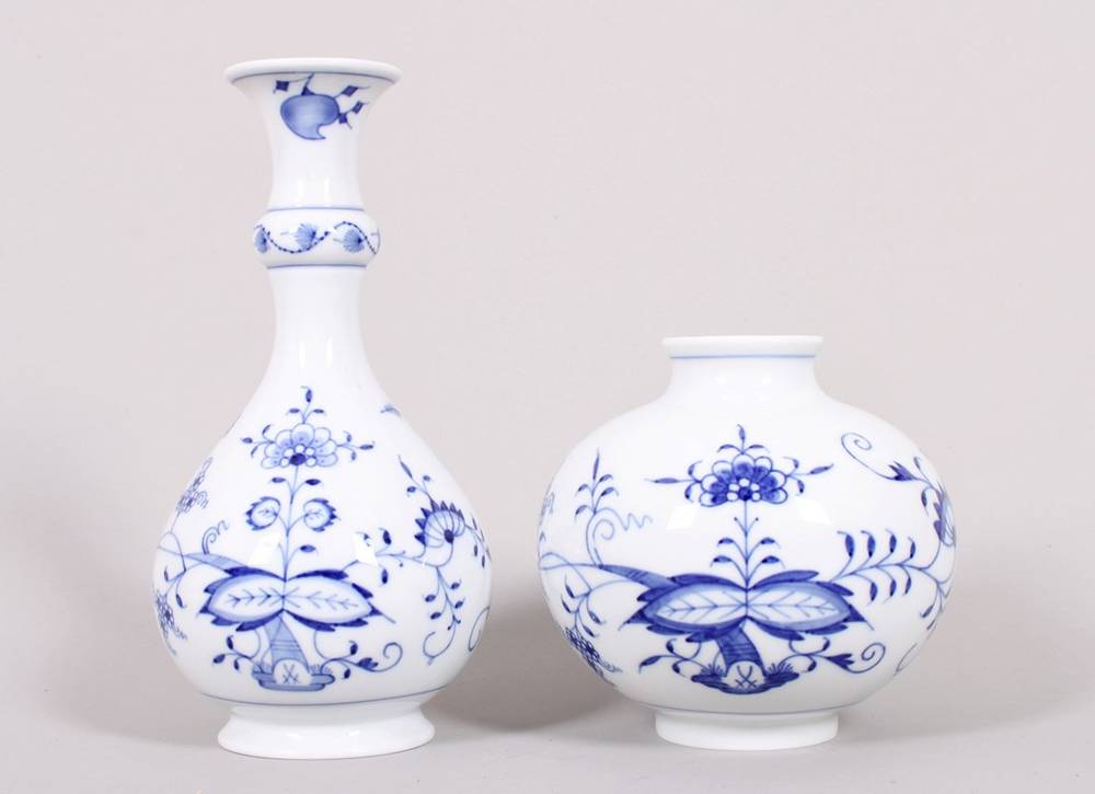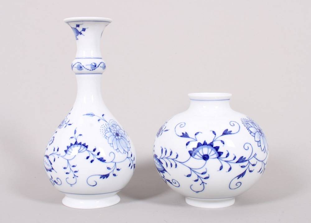 Porzellan, unter Glasur blau bemalt, eine Vase in Kugelform mit kurzem Hals und eine tiefgebauchte Vase mit nodusbesetztem langem Hals, jeweils mit flächigem Zwiebelmusterdekor verziert, im Boden (und Dekor) je unterglasurblaue Schwertermarke sowie fünfstellige Pressnummern und blaue Malernummern, H 11 und 18cm, leichte Gebrauchsspuren