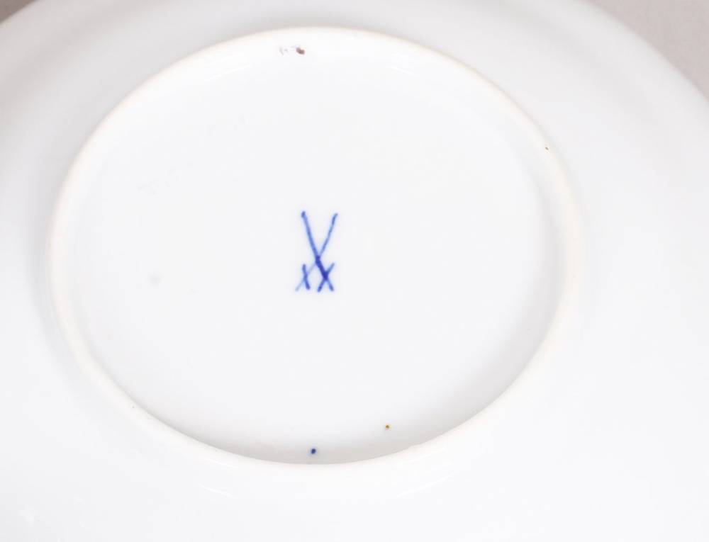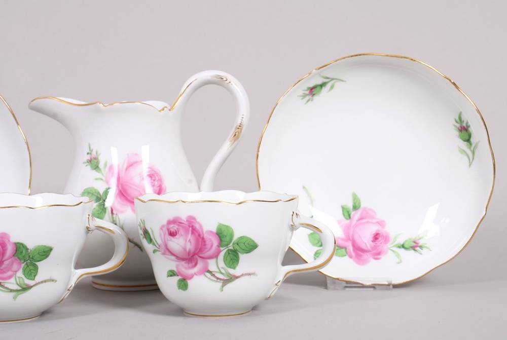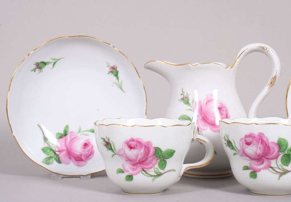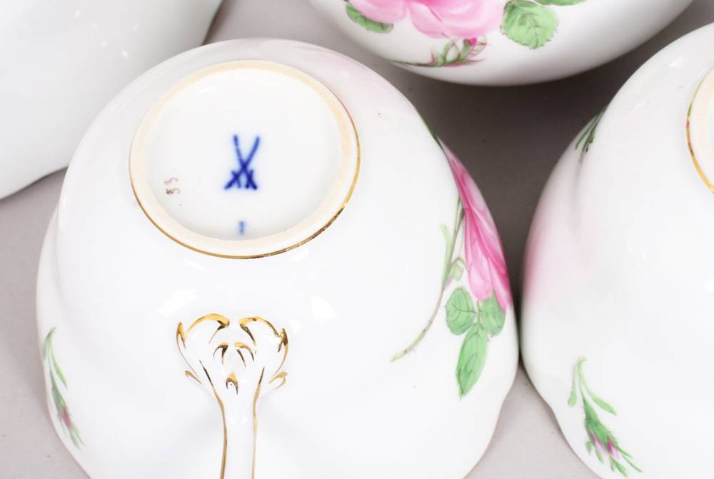 Porzellan, polychrom bemalt, Goldstaffage, mit Goldrand, Milchkrug mit Asthenkel und schau- sowie rückseitigem Rosenbouquet, Tassen und Untertassen jeweils mit Rosenbouquet und kleinen Röschen verziert, im Boden je unterglasurblaue Schwertermarke (jeweils 2-fach durchschliffen) sowie Pressnummern, H (Milchkrug) ca. 13cm, H (Tasse) 6,5cm, Gebrauchsspuren, stellenweise Goldberieb