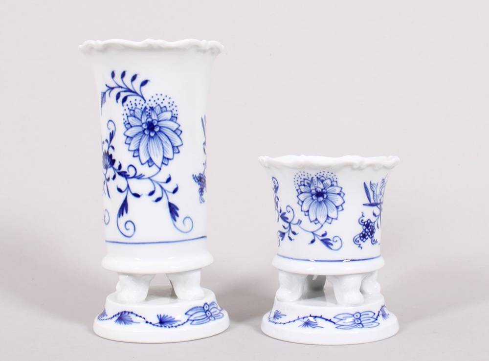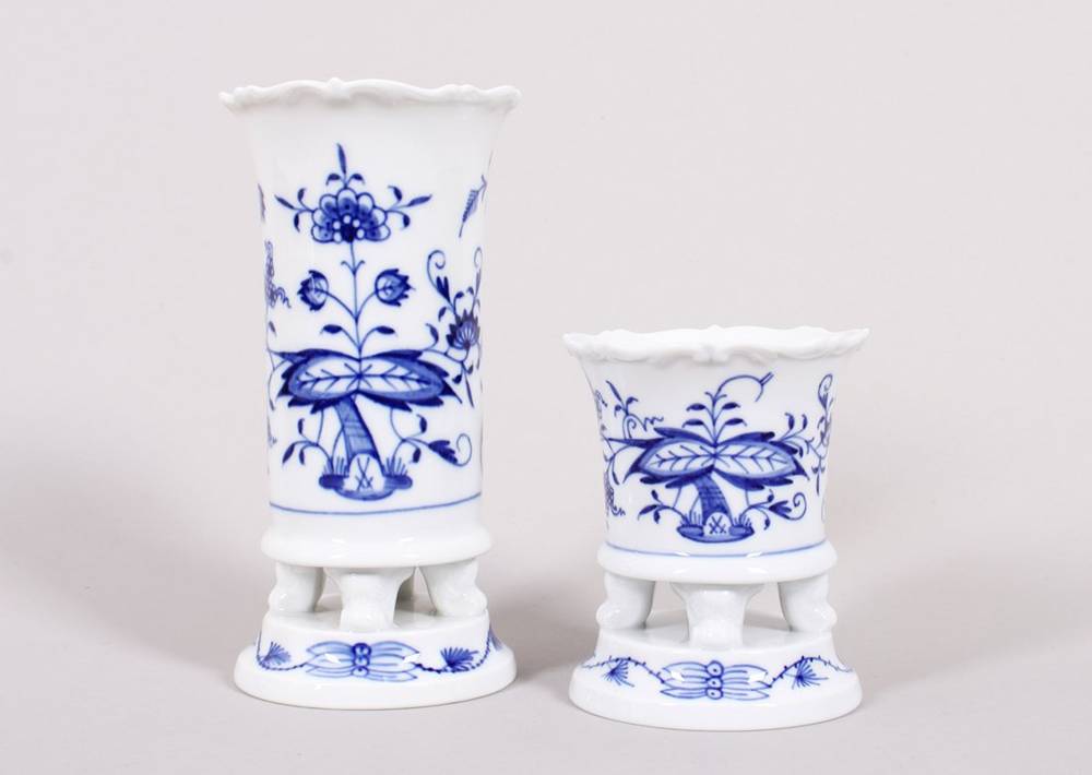 Porzellan, unter Glasur blau bemalt, jeweils auf rundem Stand und vier Füßen konischer Korpus mit leicht ausgestelltem bewegtem Rand, Korpus mit flächigem Zwiebelmusterdekor verziert, im Boden (und Dekor) je unterglasurblaue Schwertermarke sowie fünfstellige Pressnummer, H 8,5 und 14,5cm, minimale Gebrauchsspuren