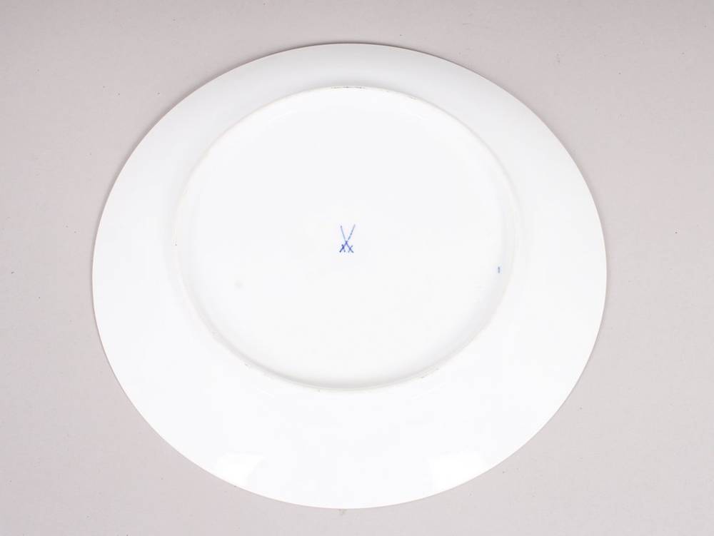 Porcelain, polychrome painted, round, shallow plate decorated with a large-scale peony and insect motif, gold bands around the rim, underglaze blue crossed swords mark (ground four times, so-called "official Meissen") and impressed numbers on the base, diameter 26 cm, slight signs of wear on the foot ring