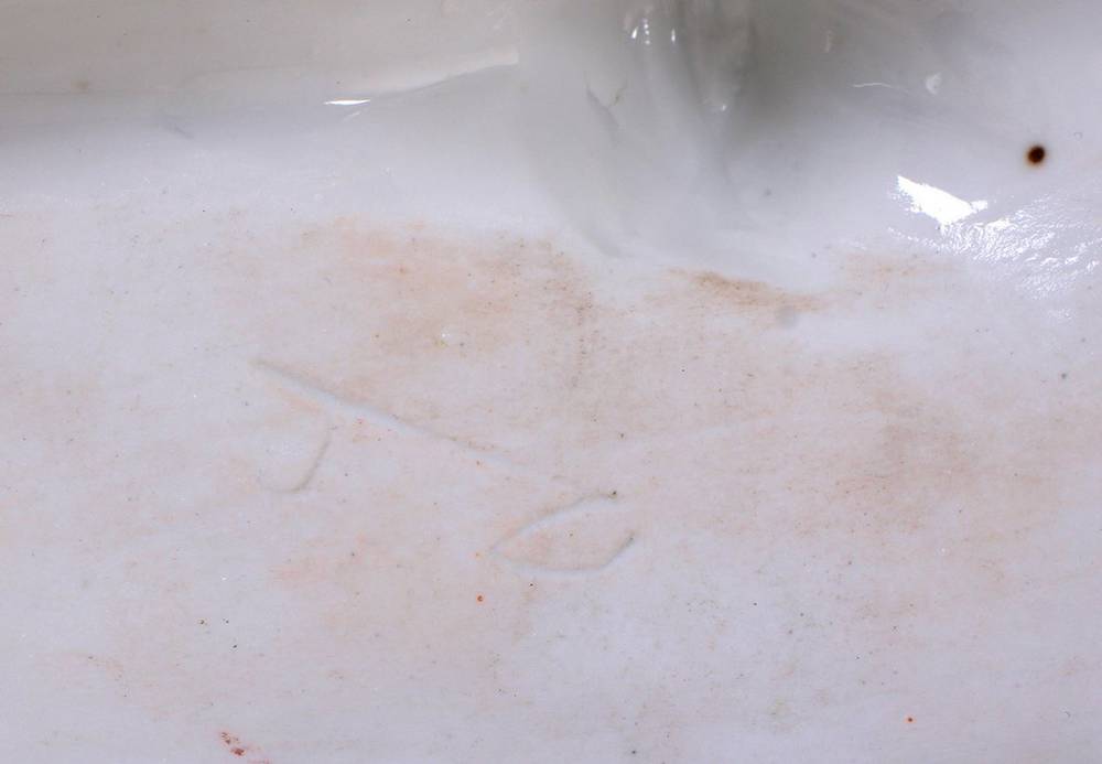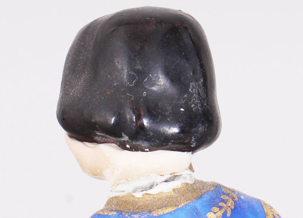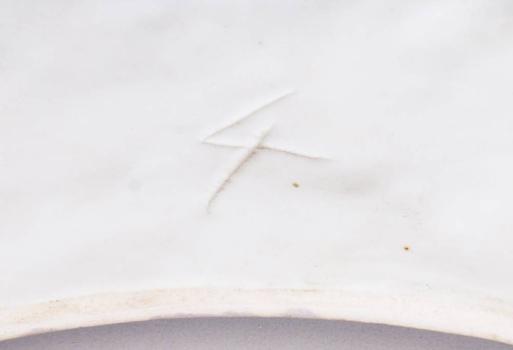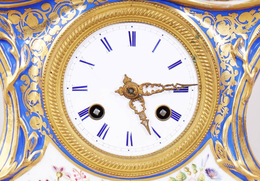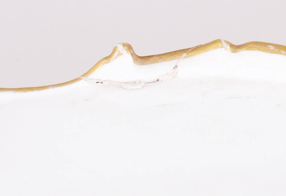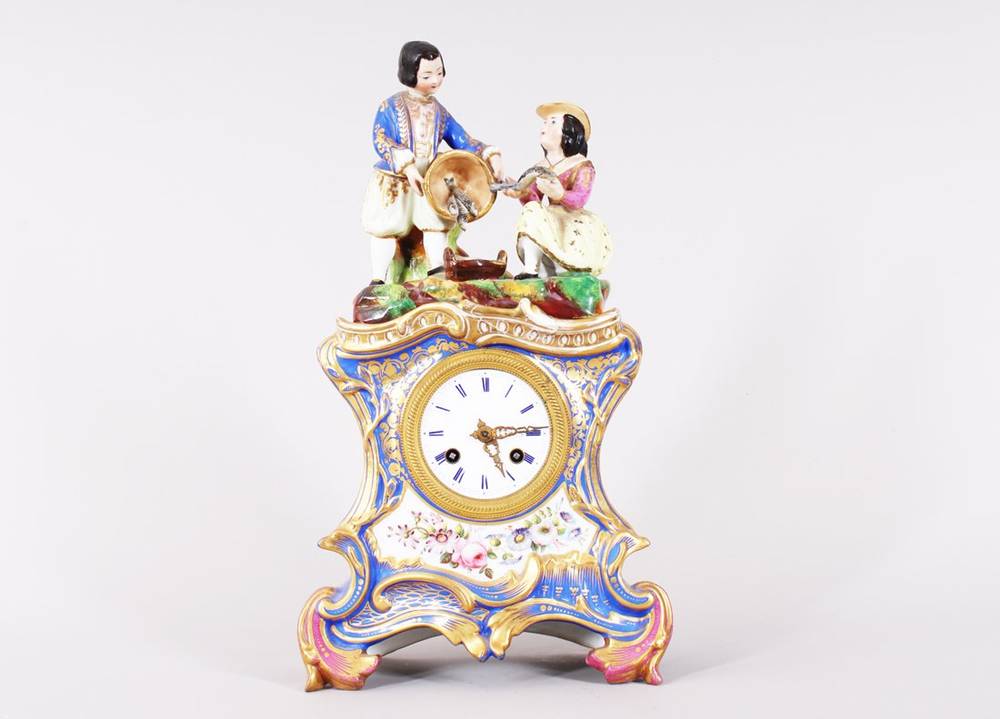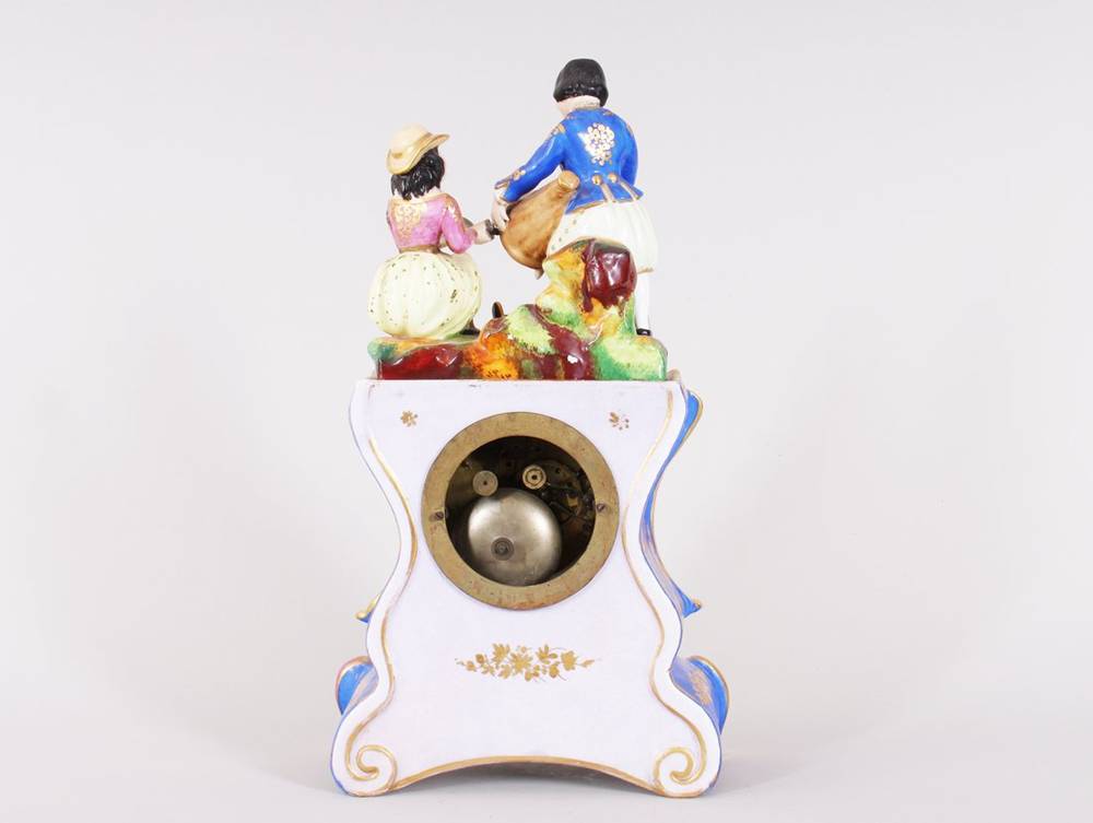 Porzellankorpus, polychrom und gold bemalt, bekrönt von Fischerpaar mit Fang, weißes Emaille-Zifferblatt mit römischer Minuterie, Fadenaufhängung, Halbstundenschlag auf Glocke, ca. 36x20x11cm, Alters- u. Gebrauchsspuren, Zifferblatt mit Haarrissen, Korpus altrest, Fischerkopf geklebt, Werk ohne Funktion