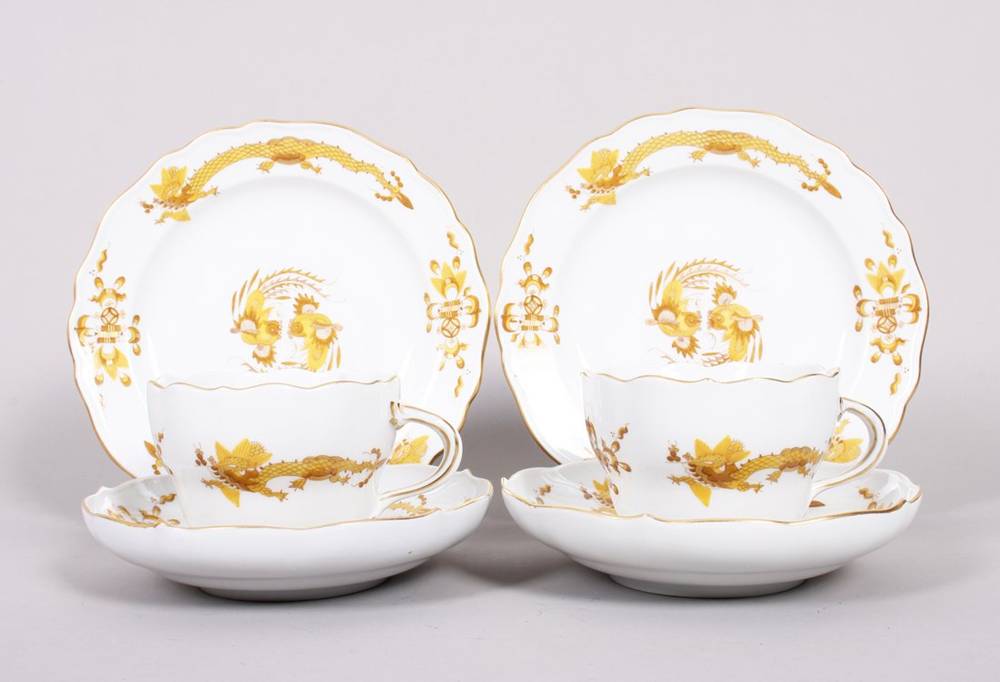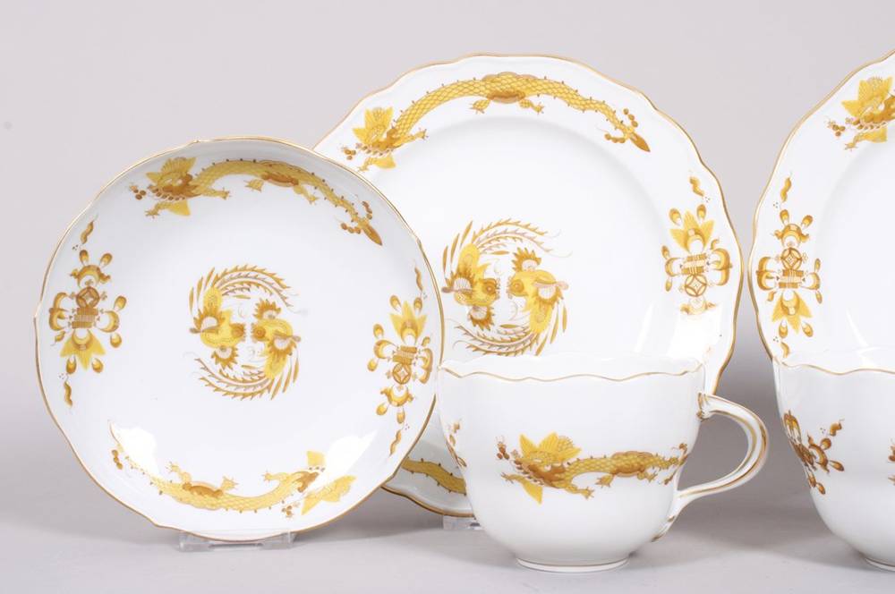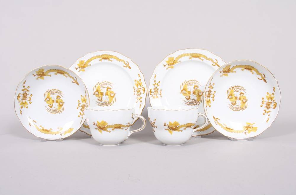 Porzellan, gelb und ockerfarben bemalt, goldstaffiert, mit Goldrand, bestehend aus zwei Kuchentellern mit jeweils korrespondierender Tasse und Untertasse, im Boden jeweils unterglasurblaue Schwertermarke sowie Press- und Malernummern, D (Kuchenteller) 18cm, H (Tasse) 6,5cm, sehr leichte Gebrauchsspuren