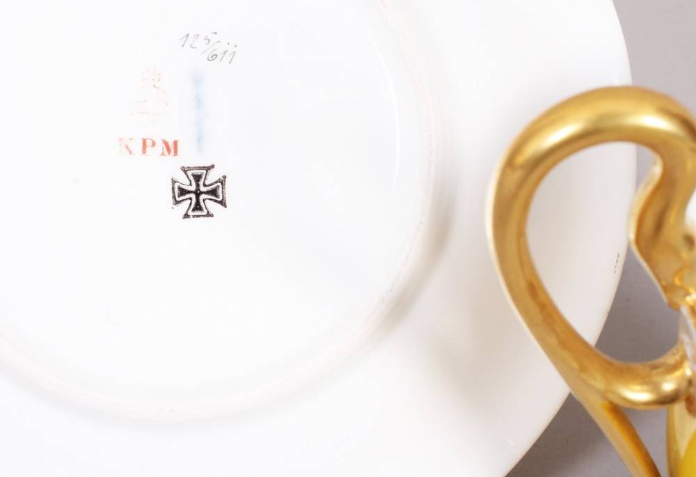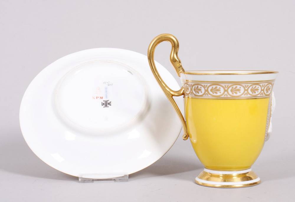 Porcelain, yellow glazed and gold painted, Empire style with serpent handle, oval reserve on the front, portrait of the German Empress and Queen of Prussia in gold-etched vermiculite ground, yellow ground, matching saucer, underglaze blue scepter mark, imperial orb mark and war mark as well as the date letter "Q", H approx. 11.5 cm (cup), D approx. 14 cm (saucer), signs of age and use