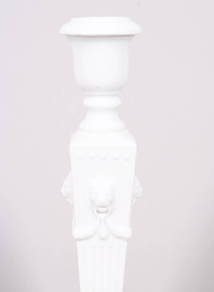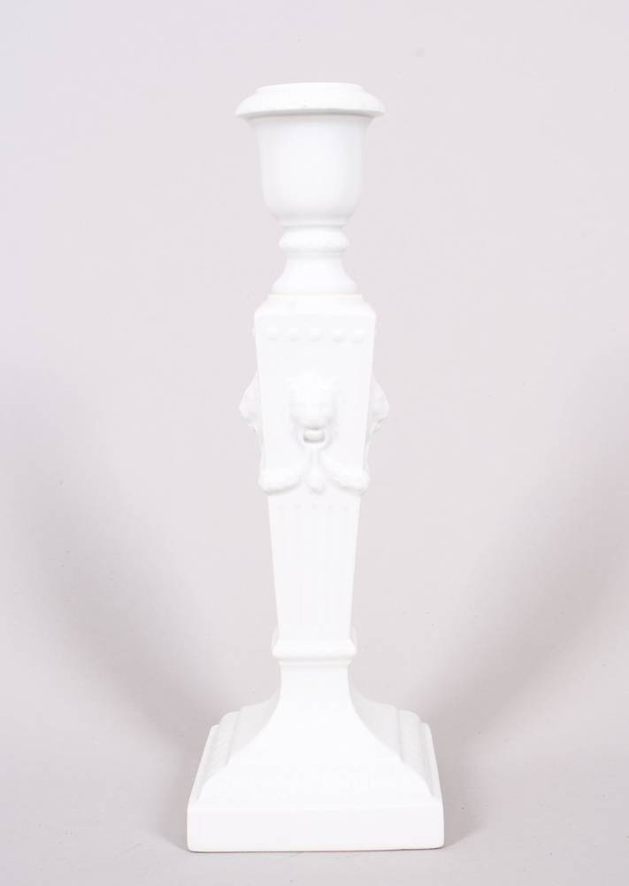 white porcelain, on a square, stepped base, a fluted, square stem with four applied lion mascarons connected by garlands, socket and base with a continuous acanthus frieze, green factory mark with blue wavy line on the base, H 23cm, slight signs of wear