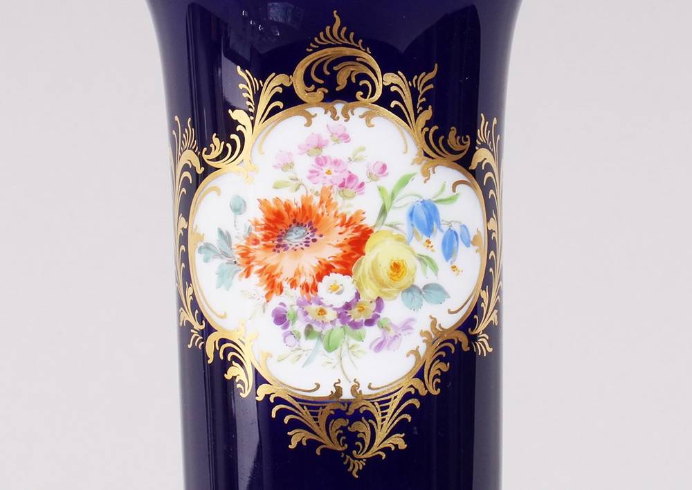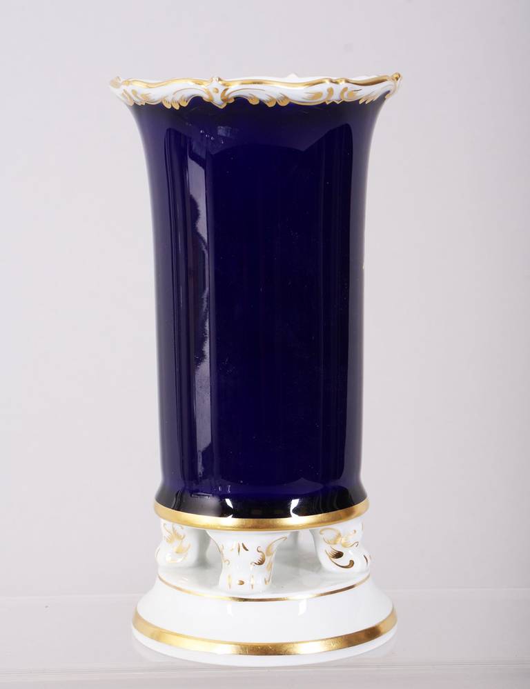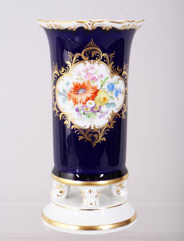 Porcelain, polychrome painted, gilded, with a gold rim, cylindrical body on a round base resting on four volute feet, on the front a lavish bouquet of flowers in a white ground decorated with gold, surrounded by a cobalt-blue background, on the base an underglaze blue sword mark and a five-digit press number, height approx. 14.5 cm, minimal signs of wear