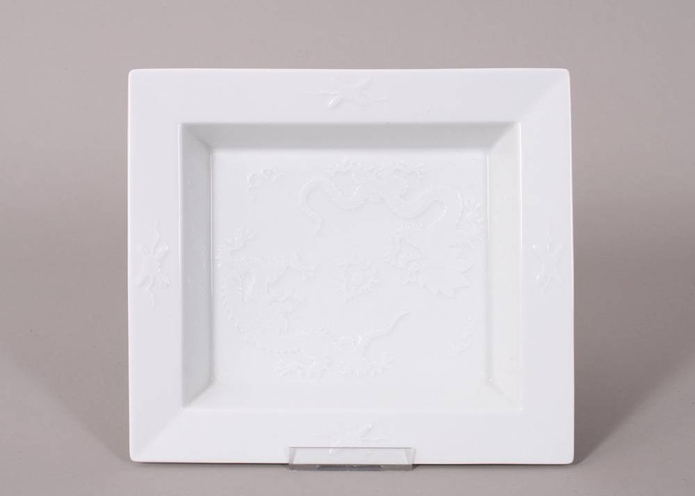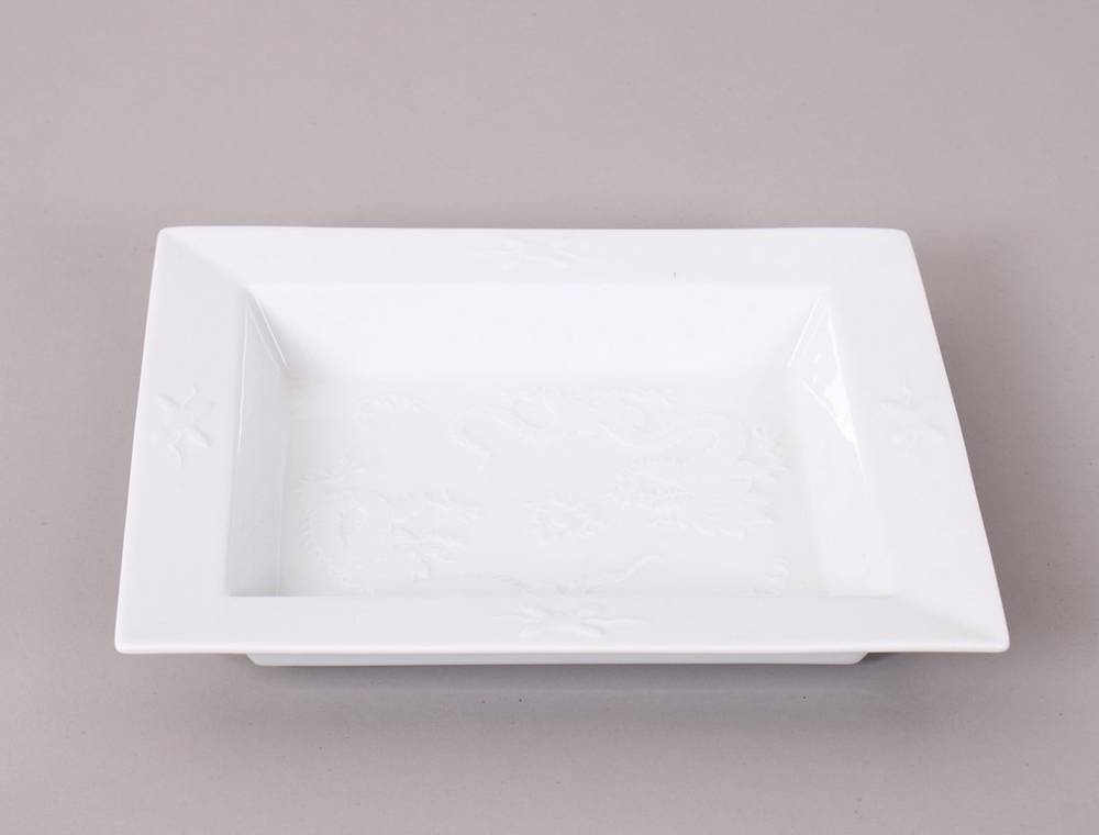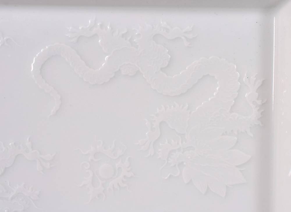 Weißporzellan, rechteckige Schmuckschale mit konisch ansteigender Wandung und ausgestellter Fahne, im Spiegel Dekor "Relief-Drache", im Boden unterglasurblaue Schwertermarke, ca. 3,5x21x18,5cm, leichte Altersspuren