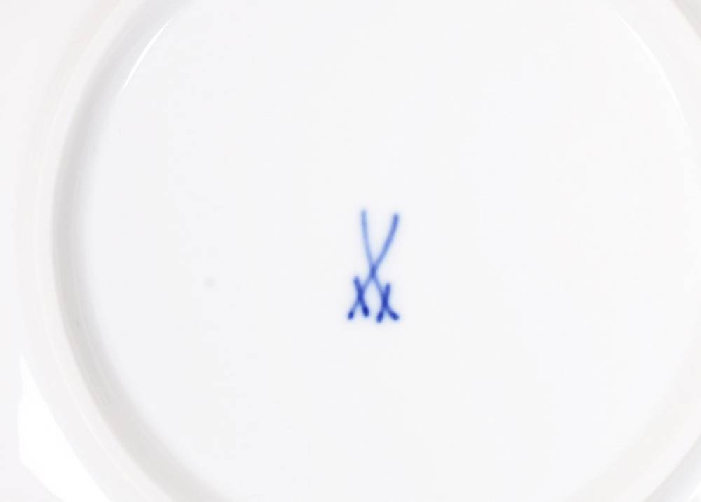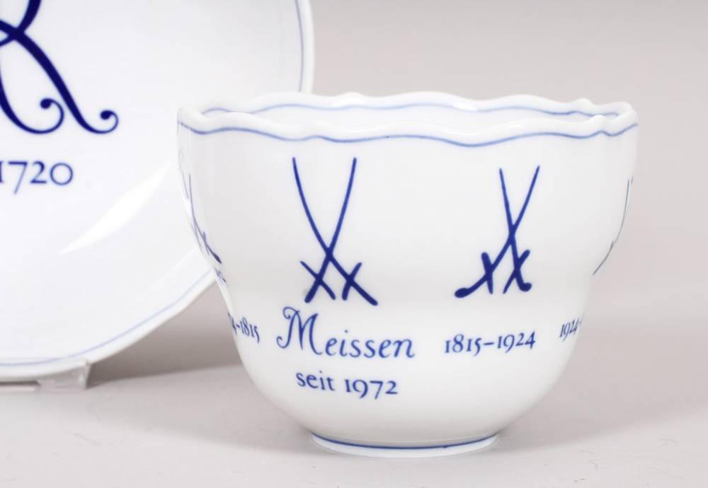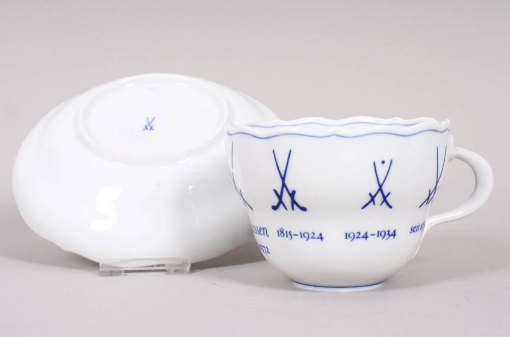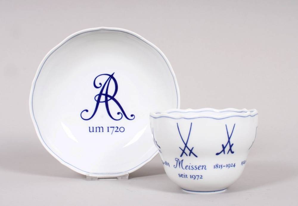 Porzellan, unter Glasur blau bemalt, hochgebauchte Tasse mit Asthenkel, auf Wandung umlaufend die Variationen der gekreuzten Kurschwerter seit 1725, dazu korrespondierende Untertasse mit "AR - um 1720" (Augustus Rex) im Spiegel, im Boden jeweils unterglasurblaue Schwertermarke und Pressnummern, H (Tasse) 6,5cm, D (Untertasse) 14cm, Untertasse am Rand minimal gechipt, leichte Gebrauchsspuren